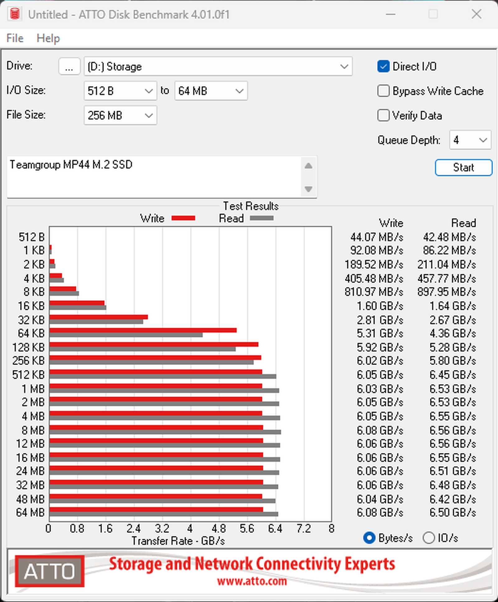 I like it when I can see consistent results out of a drive. Once the block size hits 256 KB, we see the MP44 settle into a nice comfortable spot, pushing roughly 6.5 GB/s read and 6.05 GB/s write speeds, where it rests comfortably throughout the remainder of the test. Without DRAM I would have expected to see a dropoff.