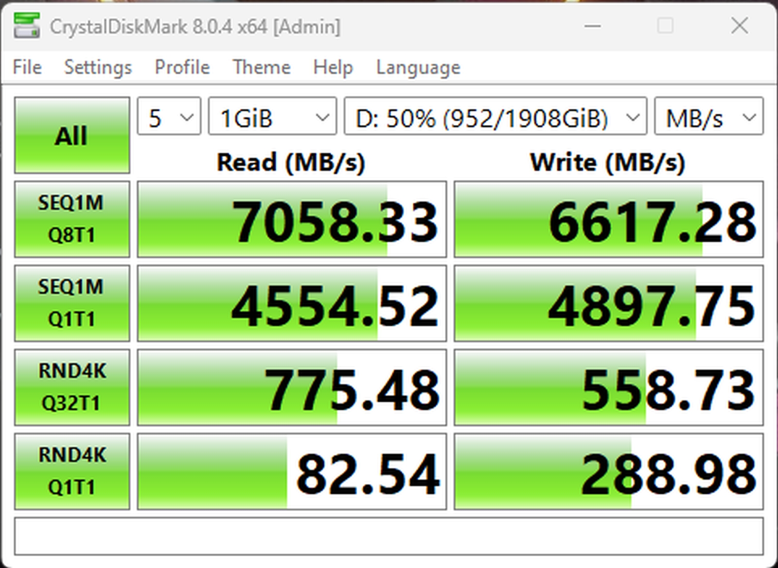 The advertised maximum rates on these drives are around 7400 / 6900, and we see a read/write speed fairly near those numbers with the drive at 30% full. Pumping it up to that 90% mark that should cause this drive to fall off a cliff in terms of performance, but somehow…it doesn’t. Remarkably, there’s almost no difference between empty, partial, half, or even almost full in terms of read and write speeds. That new Maxio controller is utilizing the RAM in my PC for that data map, and it’s doing so at a level of efficiency that I simply didn’t expect. Normally my recommendation is to overbuy so you have more “usable” space at full speed, but that might not be necessary any longer. Let’s fire up CrystalDiskMark and check those theoretical maximums: