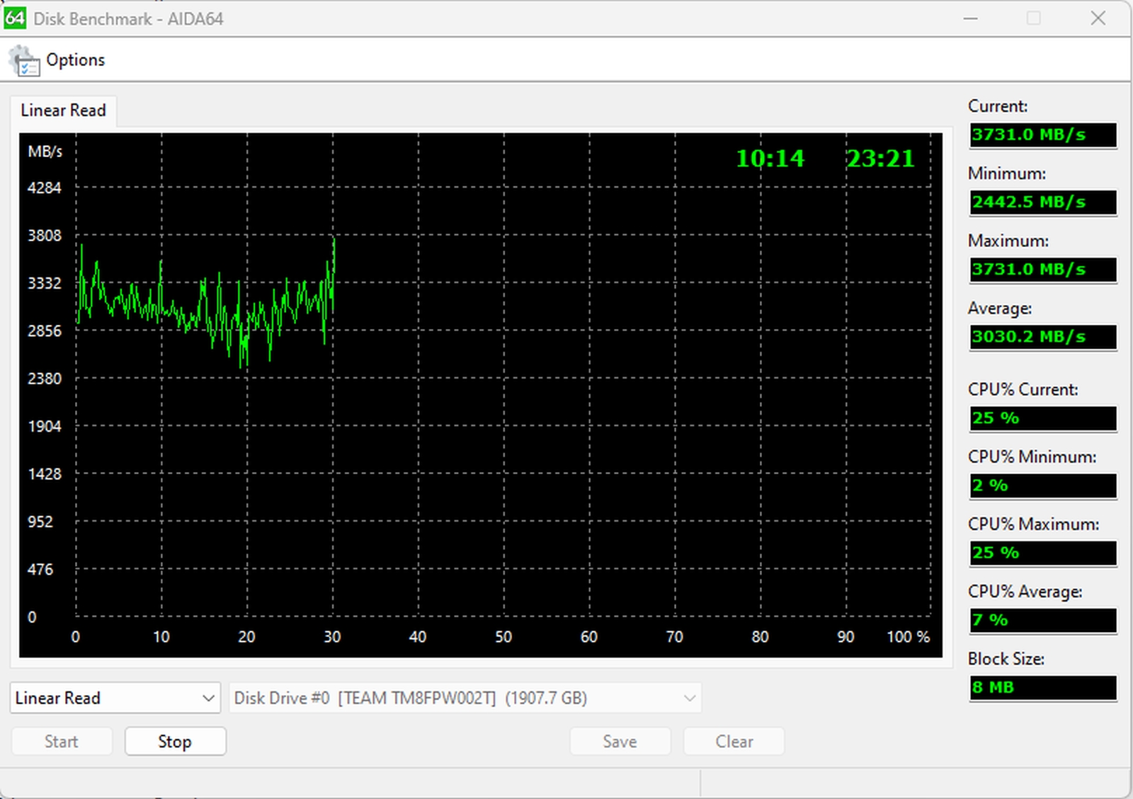 Running the AIDA64 comprehensive test we see aggregate numbers around what we found in other tests, for similar block sizes. This graph just summarizes the others in one spot, though the 8 MB block size should be larger to properly test the drive. Let’s check out 3DMark.