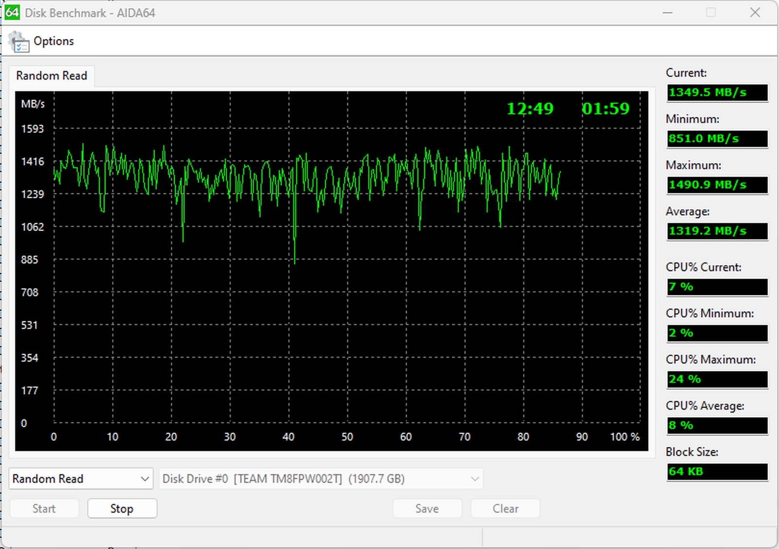 Back on PC, I’m testing this on an MSI Z790 Motherboard with an Intel 13900K processor and DDR5 running at 7600 MT/s – no bottlenecks on the test rig. We run our synthetic tests using a number of utilities including 3DMark, AIDA 64 Professional, ATTO, and Crystal Diskmark. While these will show the theoretical maximums, which is important to see the highs and lows the drive can achieve, they also give a comprehensive overview of performance over time. They also show what happens when you hit DRAM exhaustion, as well as some real-world examples of what you might see in practice. Let’s start off with Crystal Diskmark.