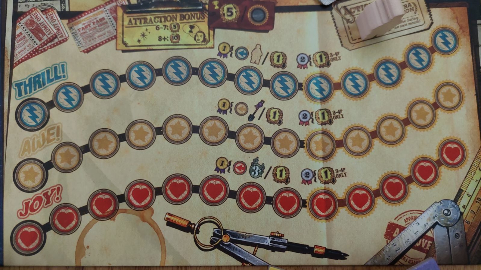 Lastly, The cleanup step simply refreshes the board for the next round. After the last round points are tallied. Aside from points accrued throughout the game from various bonuses, players earn points from goals they chose at the beginning, attractions, end-game bonuses for reaching certain levels along the emotion tracks, and a bonus based on final attraction count.