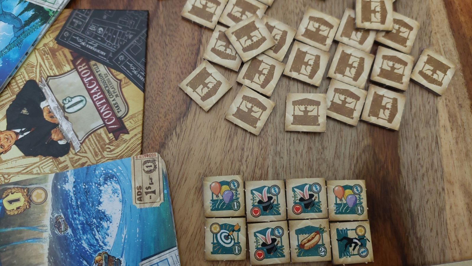 The other four actions are all fairly simple. The banker gives the player two dollars, the arborist allows the players to remove trees from their park, the contractor lets players choose from a small pool of revealed concession tiles, and the realtor allows players to buy an extra piece of land to extend their park for three dollars. Concessions are one square tiles that give small bonuses like income and emotions; they’re like free mini attractions.