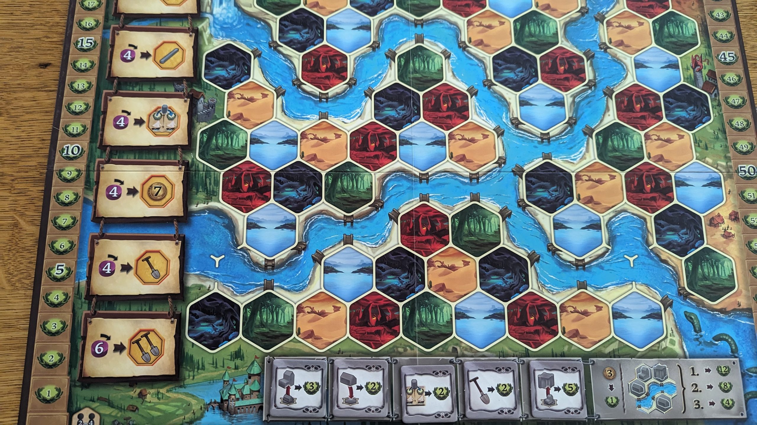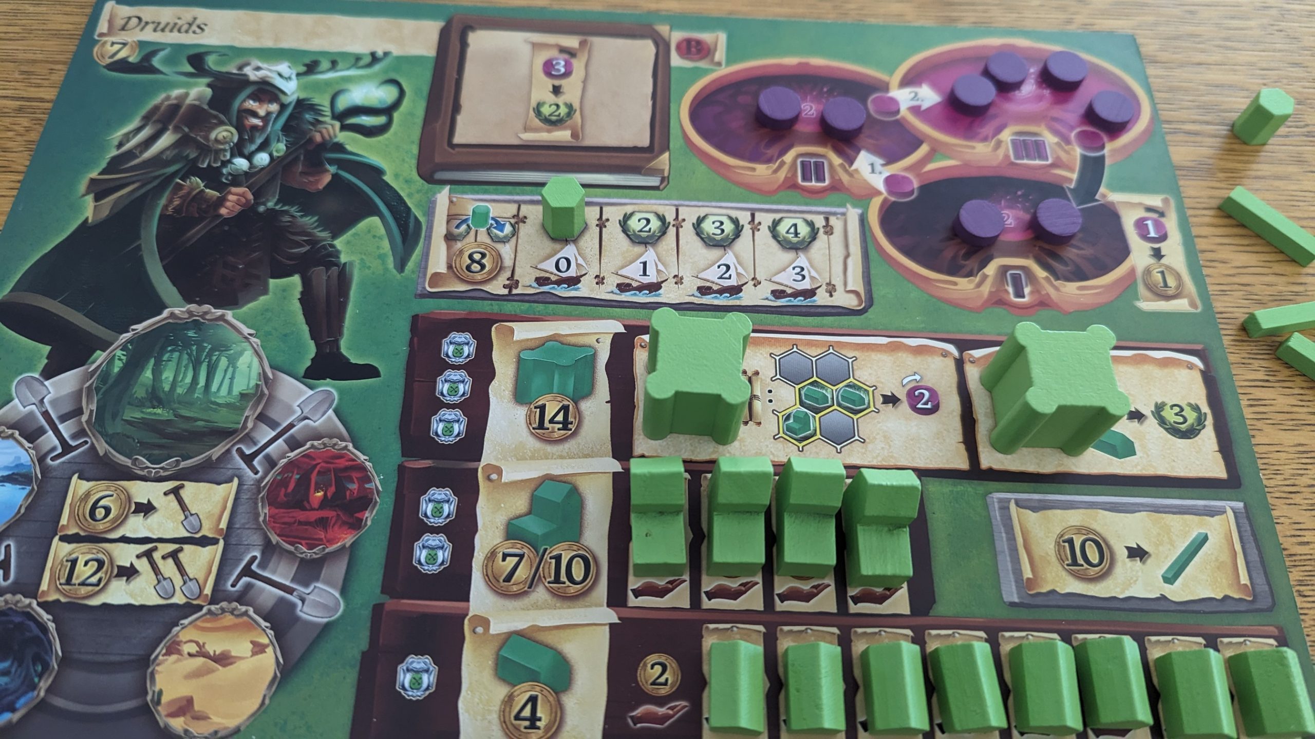 All this isn’t to say that the overall gamefeel hasn’t changed. The loss of multiple VP sources leaves players feeling like humans in a pre-agricultural society. You need to be almost single-minded in your pursuit of VP nutrition, there’s no time to dawdle. In Mystica, you’re usually safe investing in your economy, but with fewer ways to convert resources into points, you need to have a specific plan for how you’re going to get the payoff every single time you forgo points in favor of upgrading your engine. You are going to really feel it when those plans don’t work. The change is subtle, but noticeable. In short, the economic part of the game has become more forgiving, where players are less likely to bungle their board state and lock themselves out of being able to even play, but scoring has become inversely more punishing, with players whose plans faltered getting left in the dust pretty quickly.