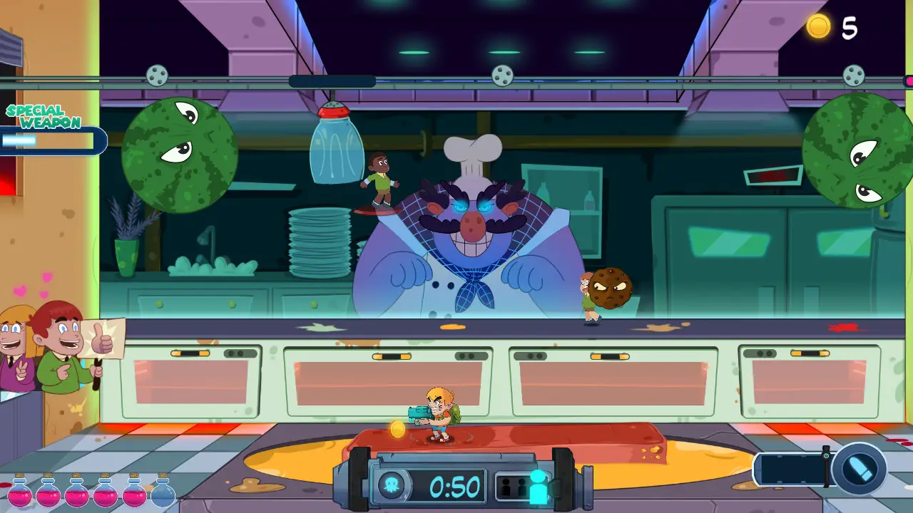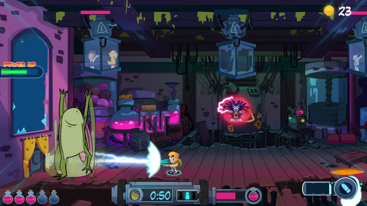 The main gameplay loop is satisfying and fun to repeat; the addition of your friends in cages is a great risk/reward mechanic as well. When I first played this game, I thought I needed to immediately free the children in cages, but unfortunately by doing that, the playing field will be overrun by enemies that you’ll need to constantly dodge. Rather, you should balance destroying the cages while managing enemies, especially since some of the ones in later stages of a world can take some punishment.