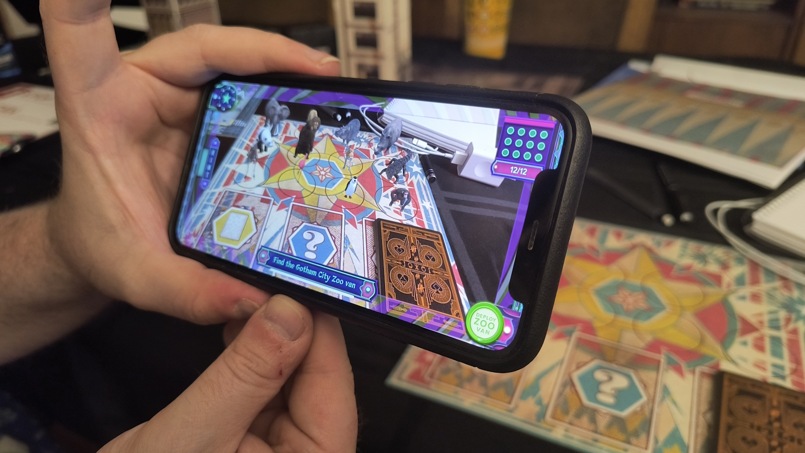 So, iPhone in hand, I got the app, and from here the game asks you to open an envelope in the box, perform some mixed reality activities using the components within, and then move onto the next envelope. Rinse and repeat for 8 chapters, and by the end, you’ll have experienced a story centering on a handful of Batman’s lesser known rogues. The story itself is pretty darn good for a licensed product. Between top-notch voice acting, and a deep exploration of a very undersold villain, you experience and solve a wild heist.