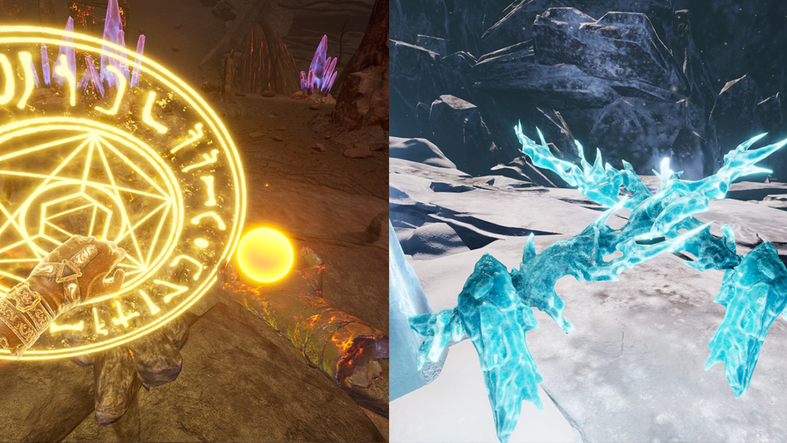 Pictured: Left side – Arcane Shield on the left hand, Fireball on the right hand. Right side – Dual Ice Swords