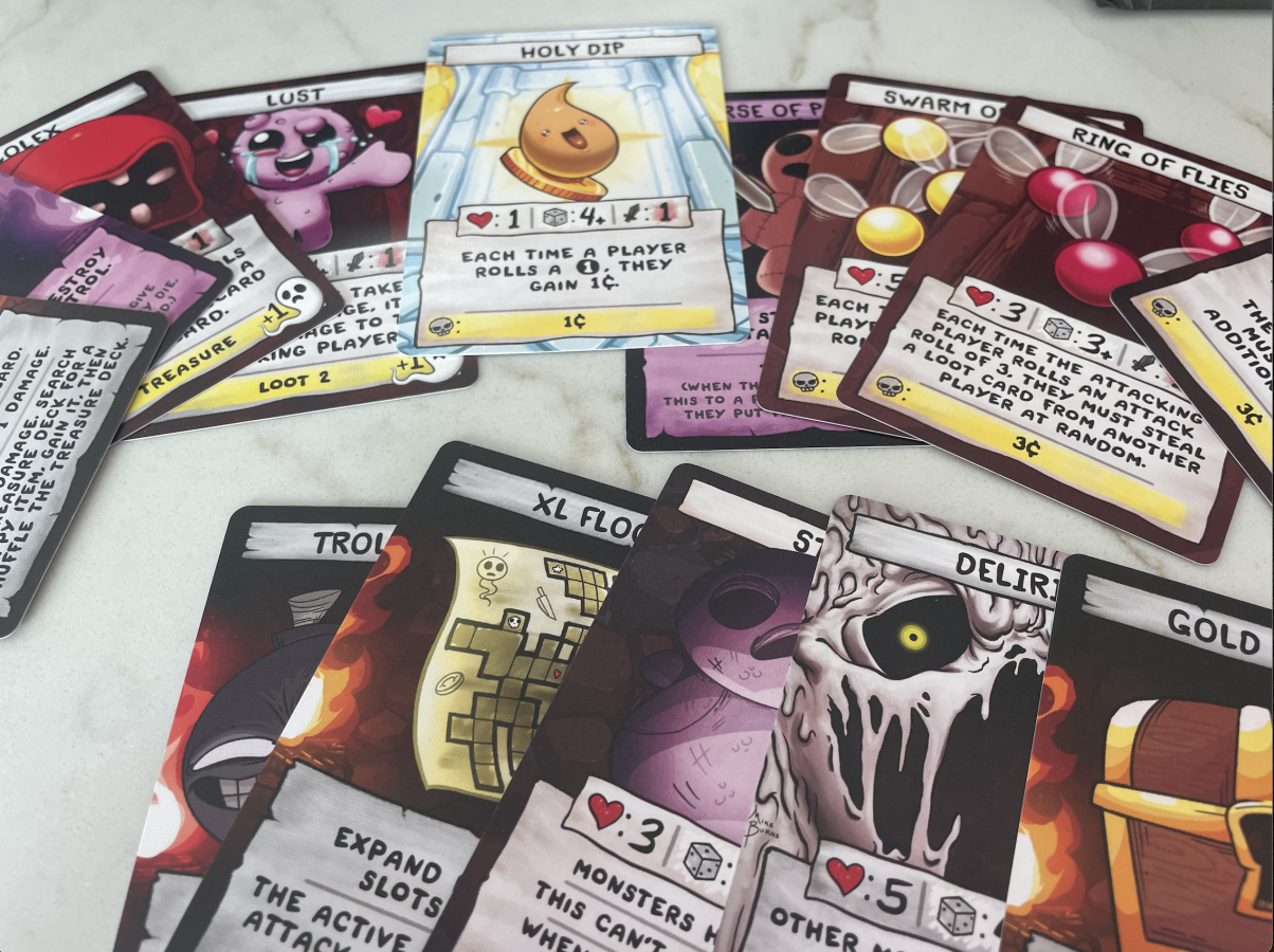 The Binding of Isaac: Four Souls consists of three decks of cards: the monster deck, treasure deck, and loot deck. The monster deck, you guessed it, contains various enemies and bosses that come from the video game, that you must fight and defeat if you draw them. Each monster consists of its own set of health points, attack points, and reward for defeating it. Stronger monsters denoted as bosses come with a Soul symbol next to them, meaning defeating them grants you 1 out of the 4 souls needed to win the game. But this deck can also contain events, which can potentially curse or benefit the player who flipped the card. The treasure deck features powerful upgrades and abilities that can be purchased with coins and the loot deck consists of items and effects that can sabotage or help other players.