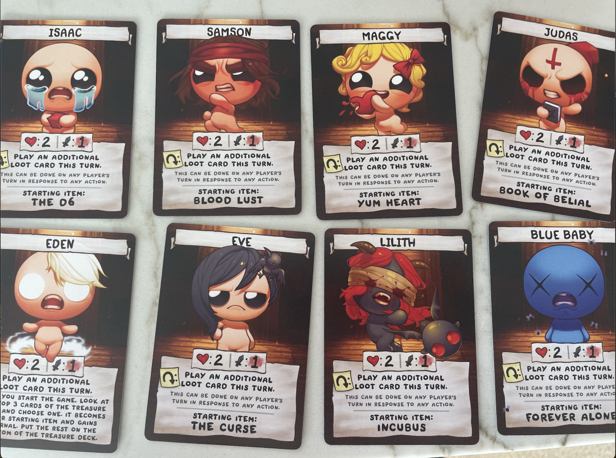 Players can choose between 1 of 11 characters to play as, each featuring their own unique starting item. Everyone also starts with 3 coins. Saddest player starts first! On a player’s turn, they can: