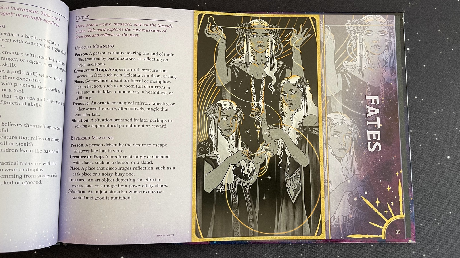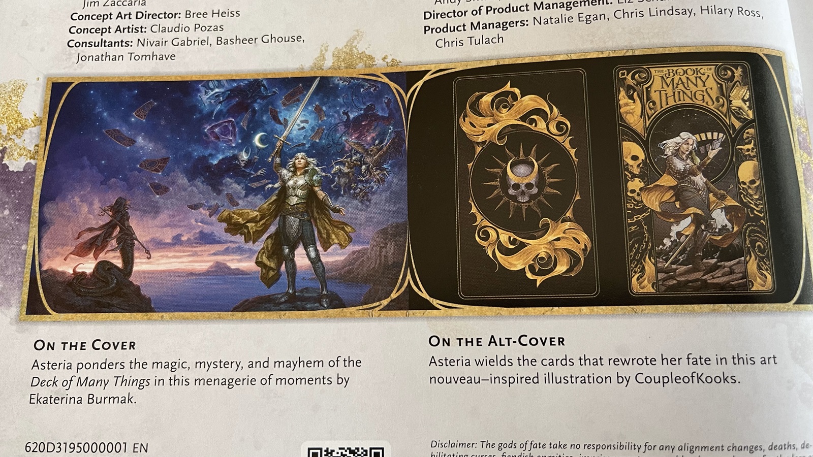 Like many Wizards of the Coast D&D publications, the Book of Many Things comes with a standard cover and an alternate cover. Both covers feature Astaria, the person for whom the first Deck of Many Things was created. The standard cover, by Ekaterina Burmak, shows Astaria standing with a sword raised in front of a starry sky full of references to the deck, and Euryale, the other character from Astaria’s story, gracing the back cover. The alternate cover, by CoupleofKooks, is more stylized, showing Astaria with a Deck floating arrayed in front of her and surrounded by a border of skulls and chains. The alternate cover also shares its art style with the cards in the Deck itself. Overall, both covers look fantastic. The art inside the book is outstanding. Many pictures clearly draw inspiration from the accompanying cards, since the cards are featured in some of the pieces in the book.