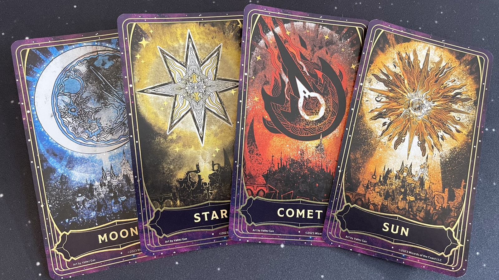 These four cards appear to show celestial events over the same town.
