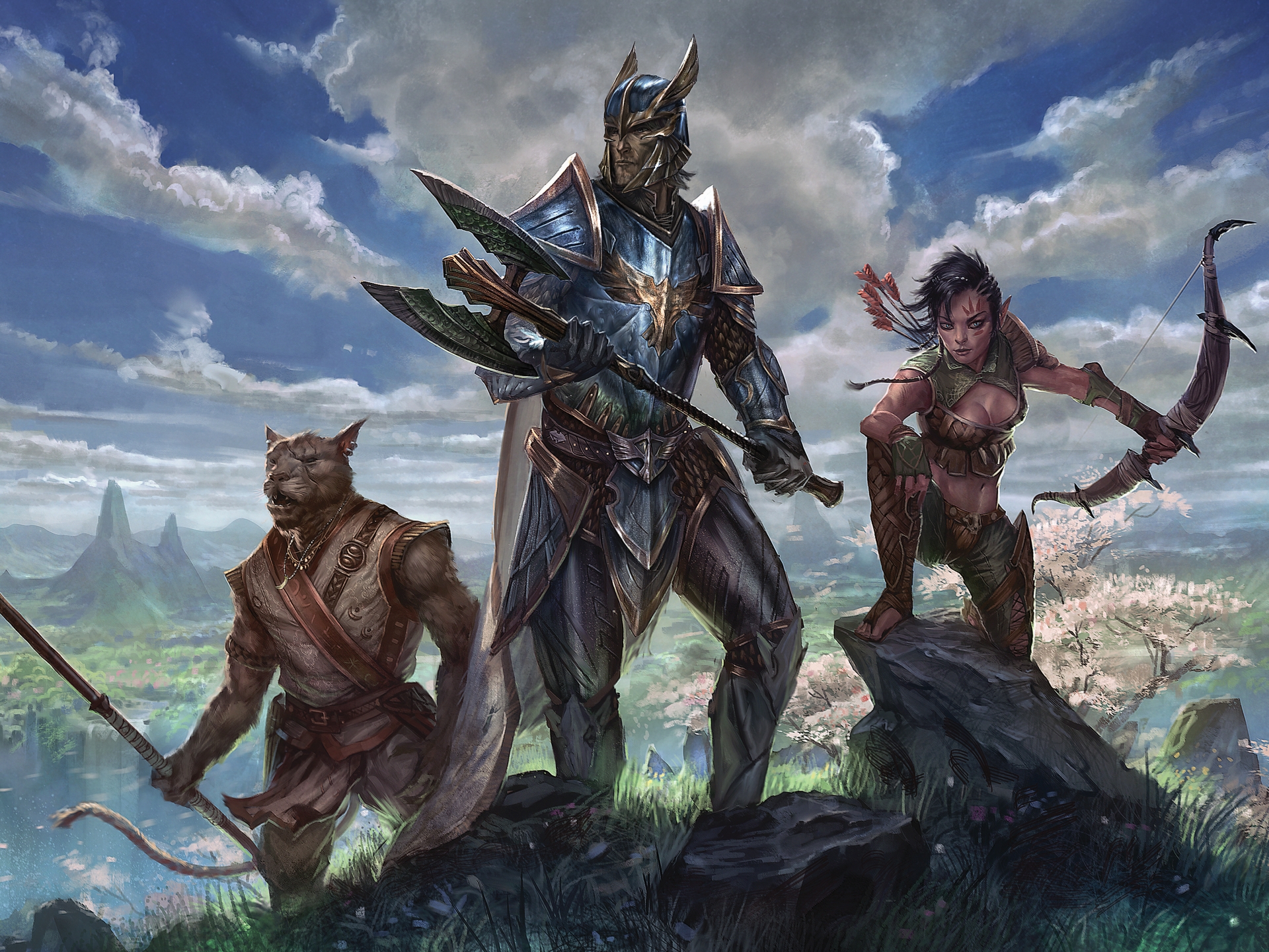 The 40 posters are bound into a semi-solid cover meant to protect the contents. With a binding on one edge, if you don’t remove the posters this serves as a gorgeous artbook. The collection itself starts off with some of the imagery we’ve seen from the early announcements of the game. The sigil of the Ebonheart Pact, Daggerfall Covenant, and Aldmeri Dominion are flanked by the frequently-seen dual-wielding Nord barbarian, the spell-slinging High Elf sorceress, and the cloaked bow-using Bosmer Nightblade, both as a trio and individually.