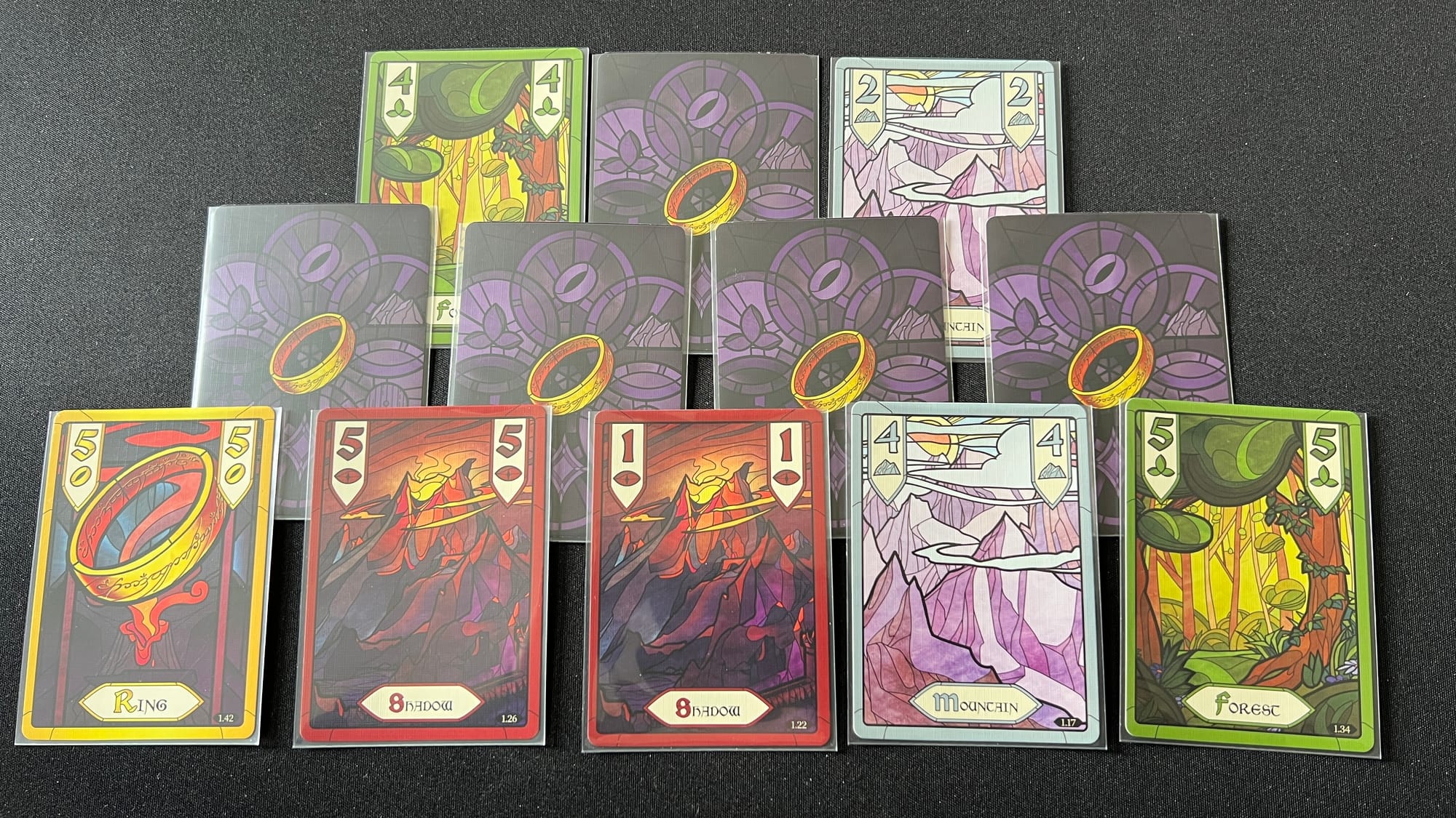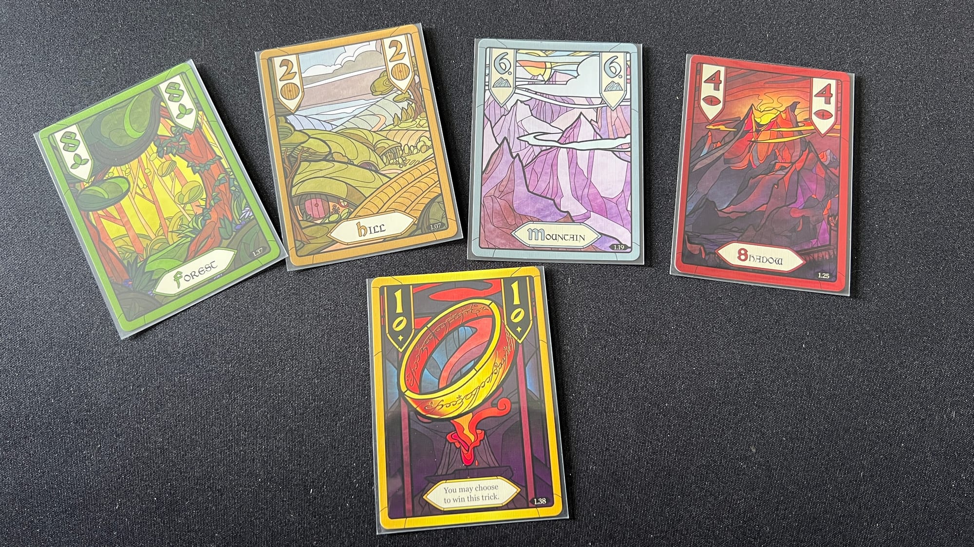The game deck is divided into four different suits: hills, forests, mountains, and shadows, each featuring a card with values 1-8. The Ring suit is the fifth suit and has cards valued 1-5. Just as in other trick-taking games, the lead player will choose a card from their hand to play, determining the lead suit. In clockwise order, players must play a card of the lead suit if they have one or any card if they do not. The player with the highest played value of the lead suit will win the trick. Unlike other trick-taking games, there is no “trump” suit. However, the ring suit is special. A ring card cannot be led until a player has played a ring into a previous trick. The “One Ring” card is the only card that can win any suit, if the player who uses it wants to.
