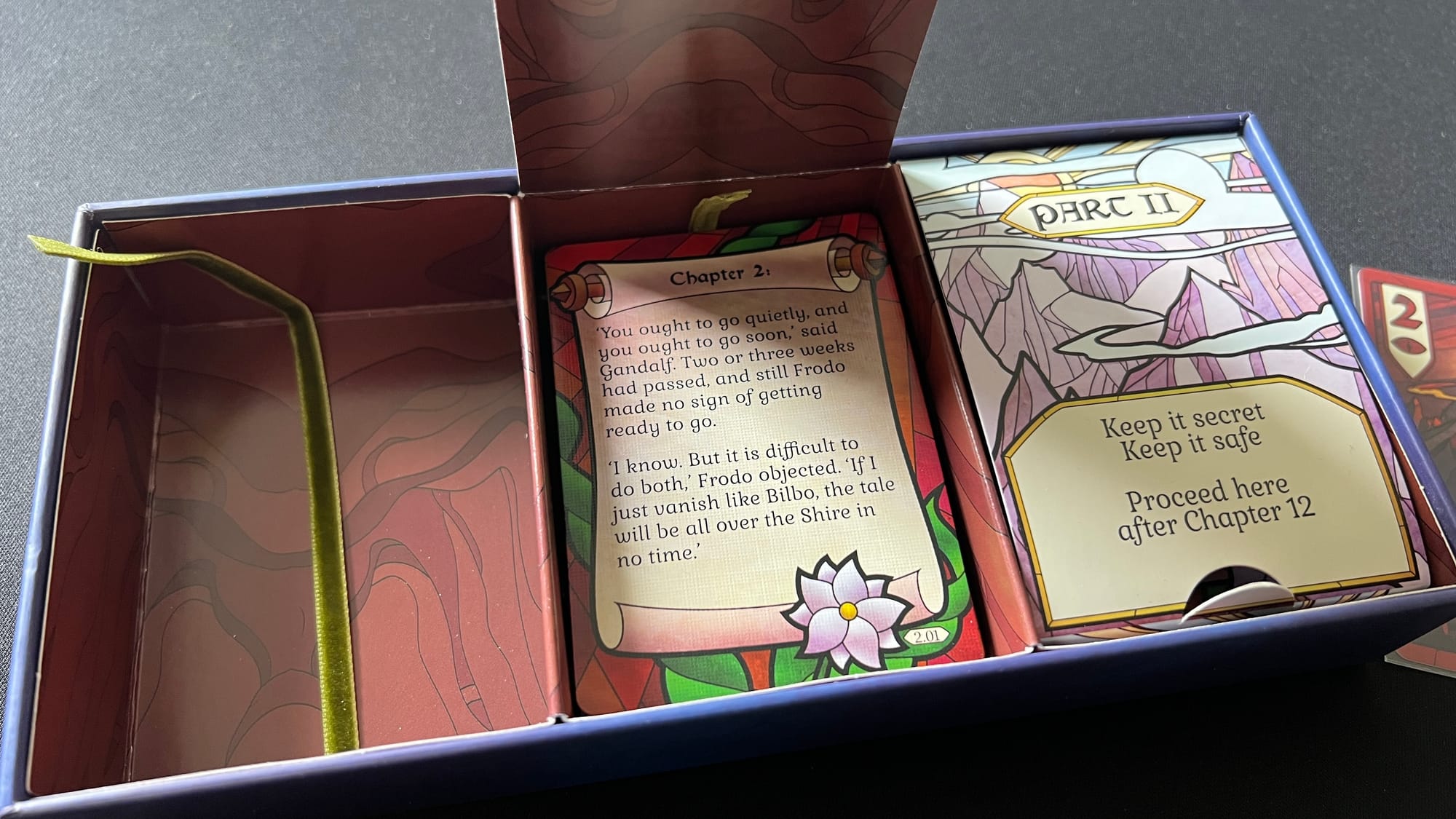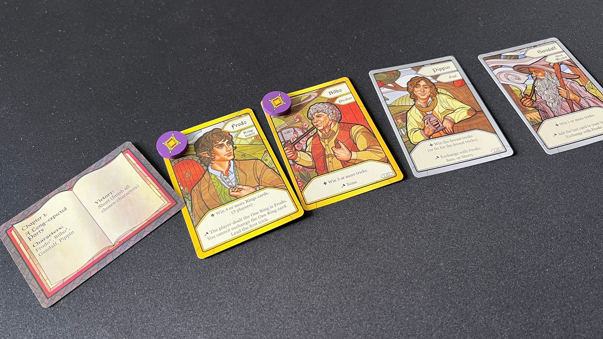 The production of this game is absolutely stunning. The artwork is all done in a stained glass window motif that highlights different aspects of the suits and characters. Artists Elaine Ryan and Samuel R. Shimota weave different colors throughout, adding an immersive wonder to the gameplay experience. The packaging comes in a small box with three different compartments, allowing for easy storage. Another nice touch is the inclusion of ribbons in the card compartments to help remove the cards from the box. Apart from cards, the game comes with 5 special tokens and a rule book. 4 tokens are used to mark characters that must be chosen in a given chapter and one larger token features a graphic of the one ring and is used to indicate when rings have entered the game and can then be led. The rule book is concise and easy to follow. The book starts with the basics needed to play through the introductory first chapter and allows you to experience the game before throwing in further rules. The outlines for the various player counts and variable gameplay are also easy to follow. My only downside for the production is the card quality. After one game, cards showed some signs of wear and tear and warping. This was easily fixed by sleeving the cards, but one might expect some higher quality from cards that will be handled and shuffled constantly.