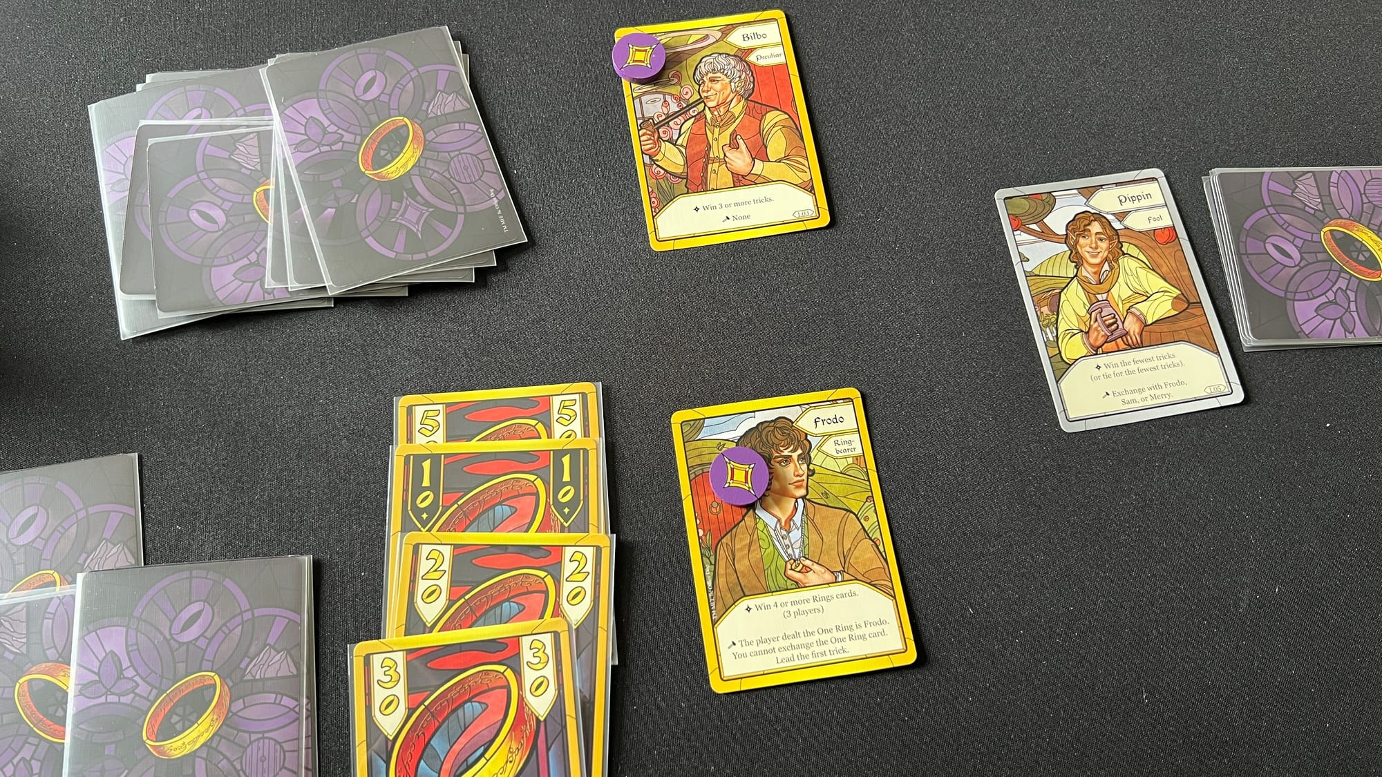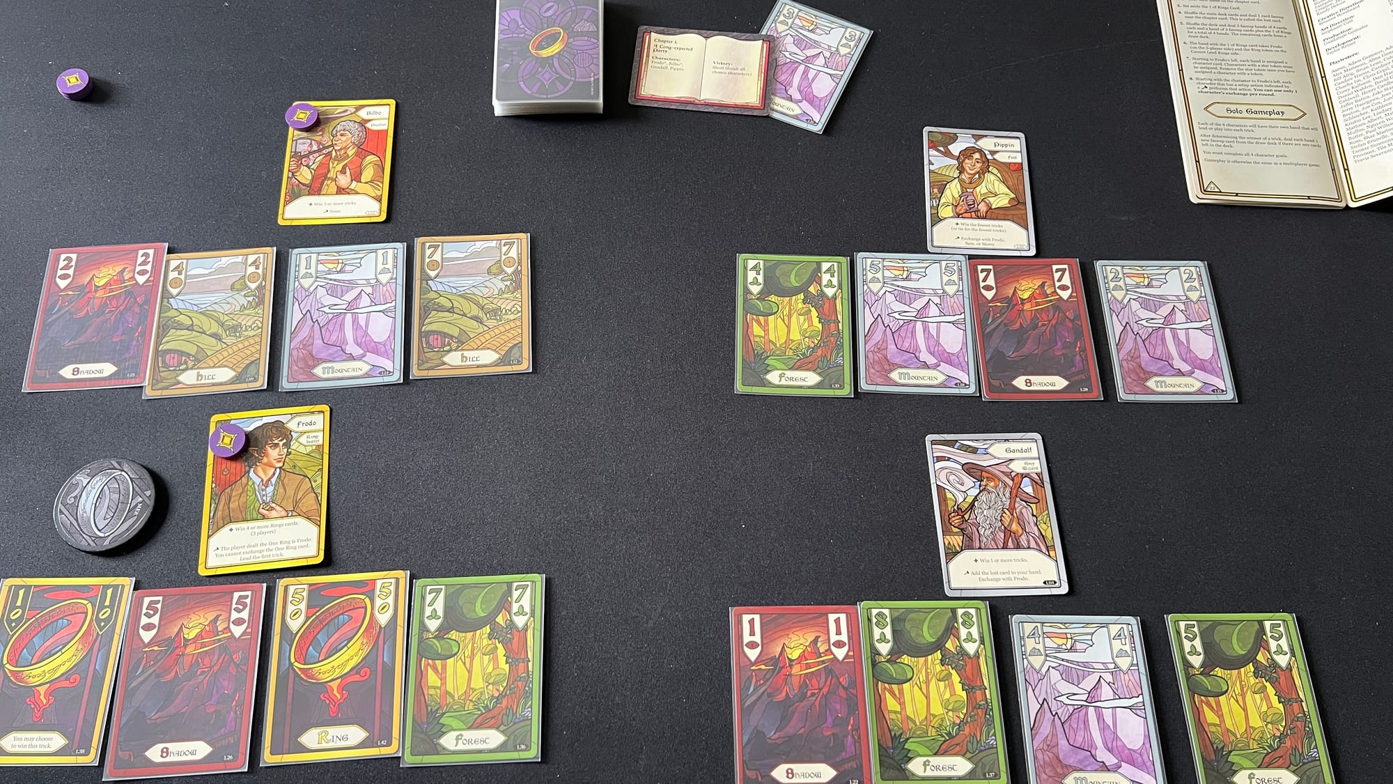 With two players, a third non-human player is set-up, controlled by the player with the One Ring. This non-human player is represented by a pyramid of cards with some face-up and some face down cards and is assigned its own character card. Uncovered cards serve as the non-human player's hand and the human players will use the knowledge to help them achieve their goals. In a solo game, players will have four different face up hands with four cards each. Each hand will also have an assigned character. The solo player will determine how each hand plays a card to the trick trying to accomplish all four character goals for the round. After each trick, a new card is randomly dealt to each hand, adding some mystery to the gameplay.