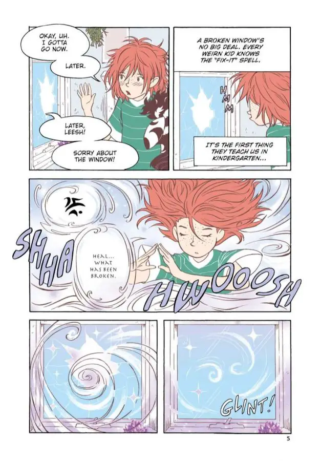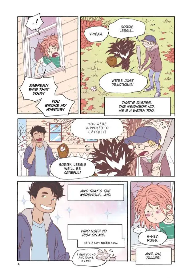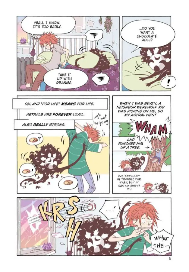 However, there were a couple things that could have some improvements; while the art style is solid, there are a lot of times when backgrounds aren’t drawn (usually with closeups of characters). While this would normally pass in a black and white graphic novel, The Weirn Books is in full color, which means that the lack of backgrounds in some panels is jarring to say the least. In addition, while the Weirns (and werewolf) have a lot of facetime and good characterization, their Astrals, who are extensions of their personalities, feel like throwaway creatures more than anything else. They’re reminiscent of magical Pokémon, but don’t feel like they complement the characters much. You could excise them from the main story and you wouldn’t miss much.