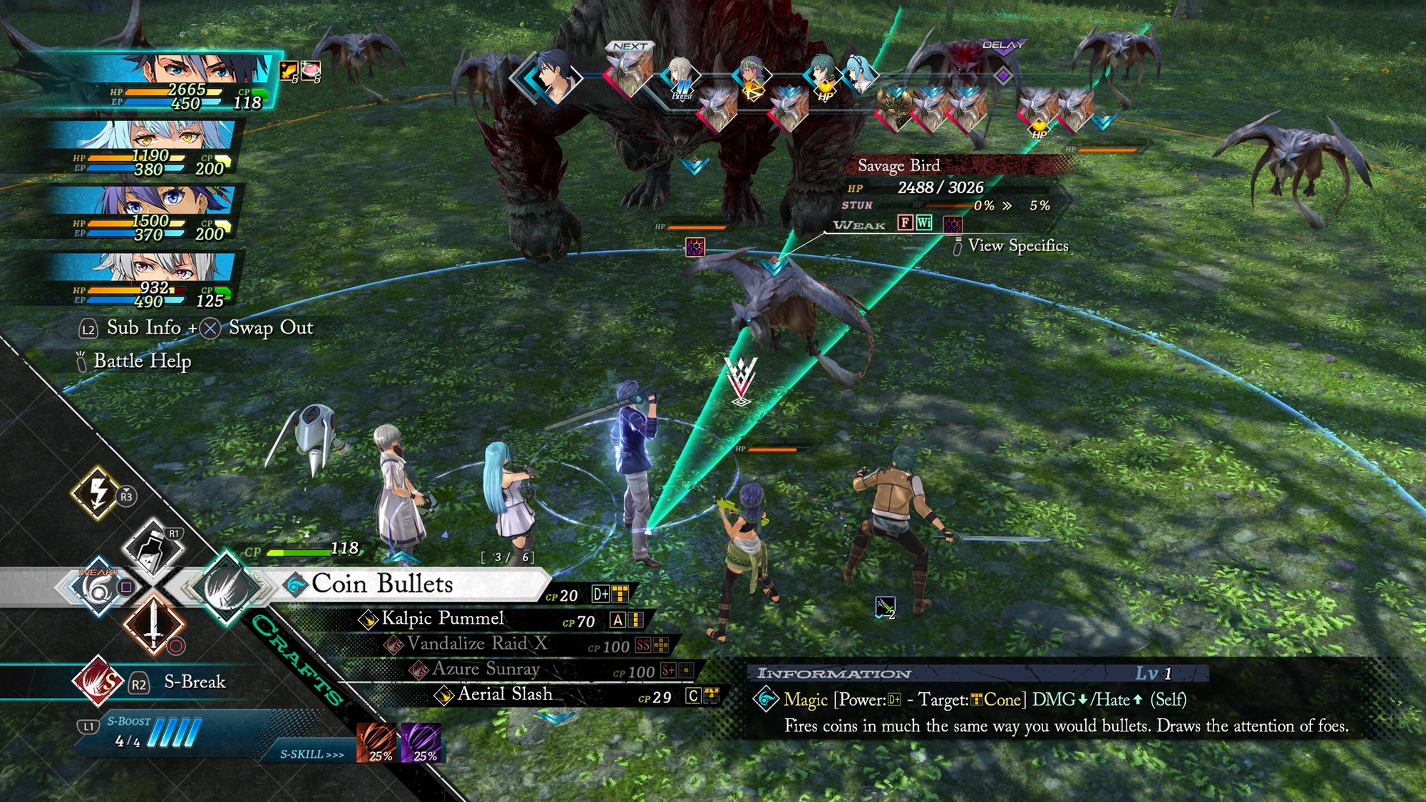 The basics of every Trails game remain here: special attacks unique to each character called Crafts that draw on CP, spells called Arts determined by the equipped Arts Driver that draw from EP, items the whole party can use, random turn buffs like guaranteed crits or free Art casts, etc. Mechanics like SCLM and S-Boost also return here, with the former allowing another party member to follow up on your attack as long as you're within range of them, and the latter letting you consume a segment of boost to either power up your next action, or use a powerful super move called an S-Craft. Boosting has changed a bit, as you no longer need two Boosts to activate an S-Craft. Instead, using two Boosts will let you act twice in a row with ZOC. If you're wondering, yes, this allows you to completely eliminate cast time for Arts, making them a whole lot more worthwhile even if Crafts are still better in every way.