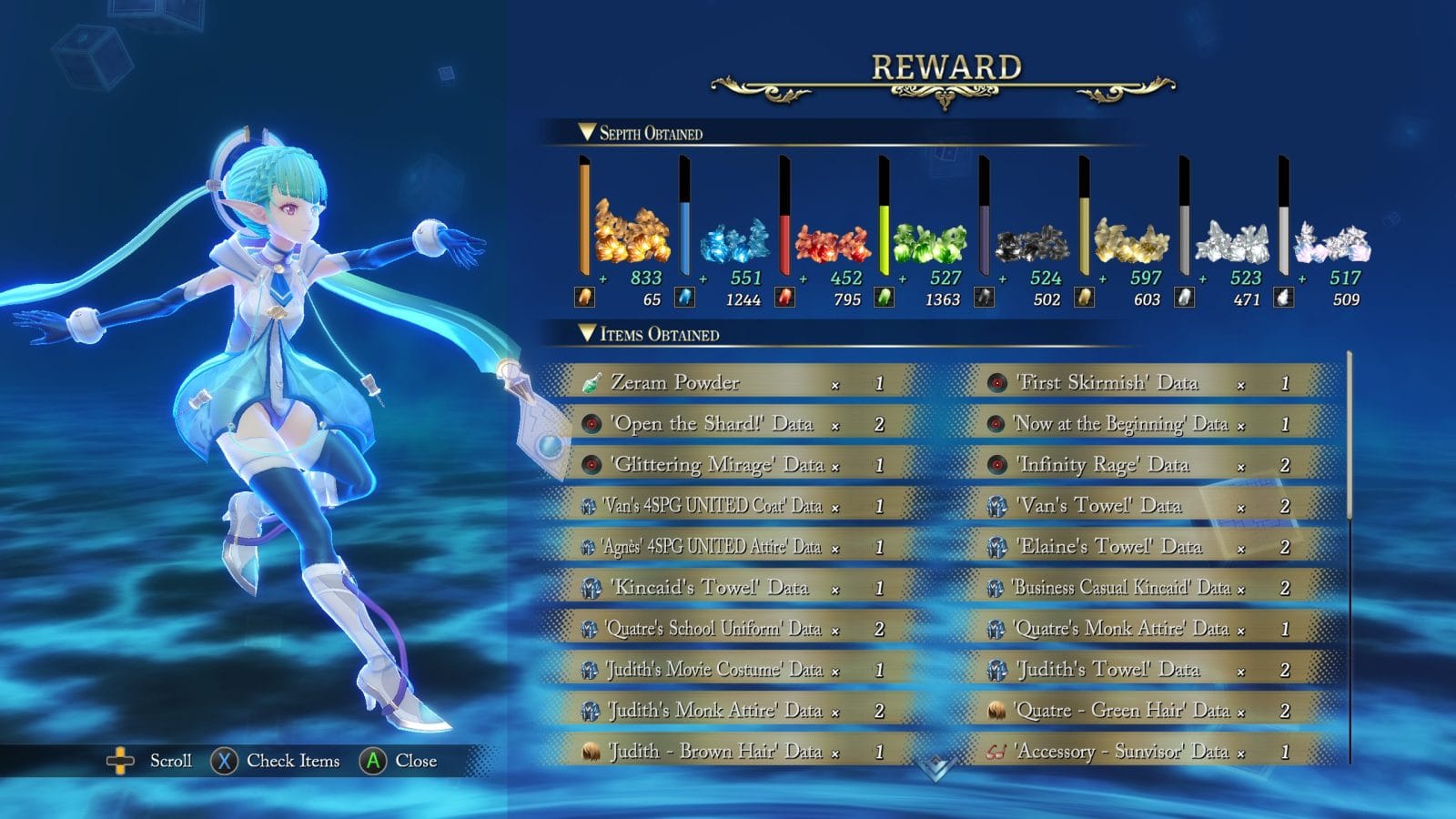 As you play, you’ll also find blue crystals you can spend on a gacha machine. This will grant you sepith to synthesize more Quartz along with some cosmetics like costumes. Märchen Garten is basically optional outside of its introduction, but you will benefit greatly from using it regularly.