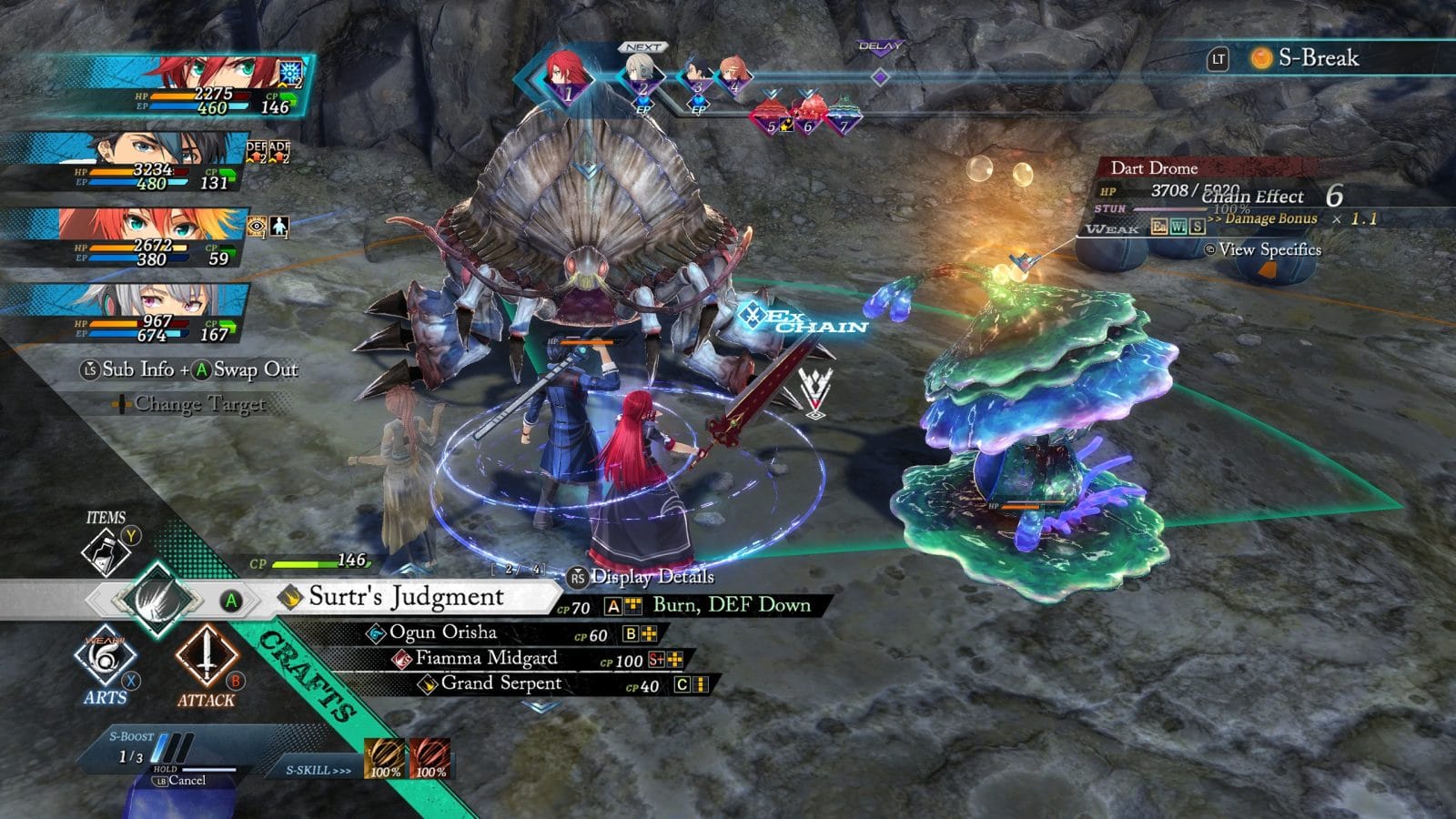 You begin every battle with a maximum of three boost gauge segments, but using an S-Craft, which is essentially a super move, will break this limit, adding more segments for you to fill. It’ll still go down to three after the battle ends, so this is most useful in boss fights. S-Crafts are flashy and fun, but use up 100 CP. Thankfully, unlike AP for arts, this is very easy to get back, especially in real-time battles, so you can really go nuts with them.
