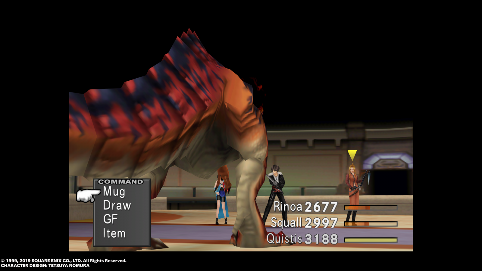 Feeding into the junction system are the magic and draw systems. Unlike previous entries, magic functions as an item; you have a limited inventory for spells and can hold up to 100 of a single spell. You get magic by using the draw command in battle. Each enemy has a selection of spells you can either stock for later or cast immediately. If you want to be as strong as you can, you’ll want 100 of each spell to junction to your characters, so you’ll have to draw 100 of each spell an enemy is carrying for each of your three party members in battle. This is where the game can get a bit tedious. In the original release, it would take a loooooong time to fill up on magic while waiting through animations and trying to keep your party alive. Thankfully, this remaster helps this process somewhat. You can speed up the game and become completely invincible just by pressing in the left and right sticks respectively. If you enable the memory cursor in the options as well, you can just hold the confirm button and watch them go. The whole drawing process takes a minute or so, so it’s a lot more bearable this time around. It’s still tedious, but much less so now. When first encountering a new enemy or boss, I would enable the 3x speed and invincibility at the beginning of battle to draw all the magic I needed, then disable both to actually fight them.