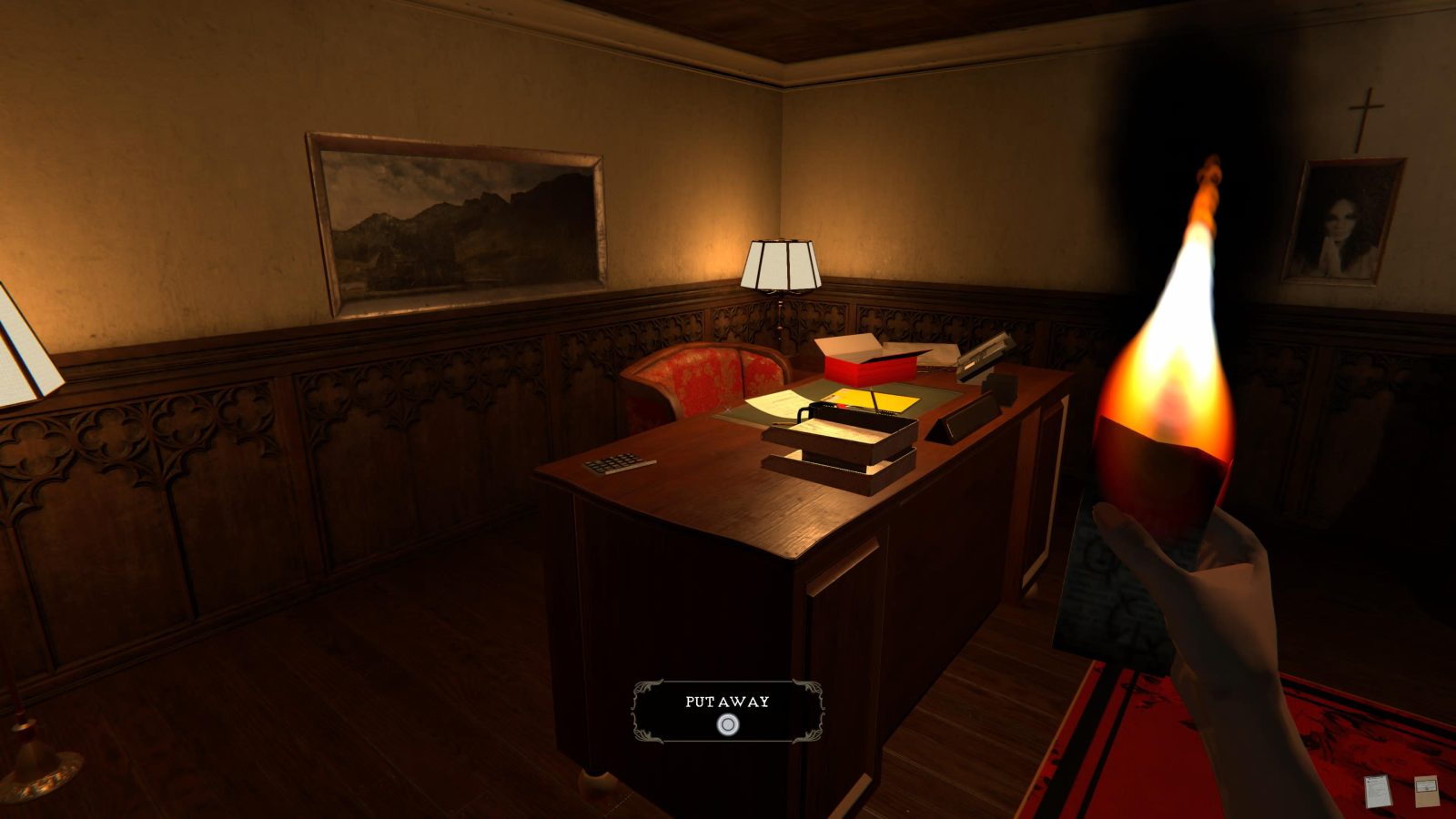 The dead aren’t your only companion at the Mortuary though, with a demonic entity slowly taking hold as the evening goes on. You’ll need to take notice of how the possession is developing, as to banish the demon you’ll need to properly ascertain clues to figure out its name as well as its host. These can be more obvious tells like the body twitching on the table, but can also be more subtle. The demon will also leave marks around the Mortuary which can be discovered by burning letting paper to reveal portions of its name. While simple, it was still fun to slowly piece together the true nature of the beast that stalked me from the darkness.