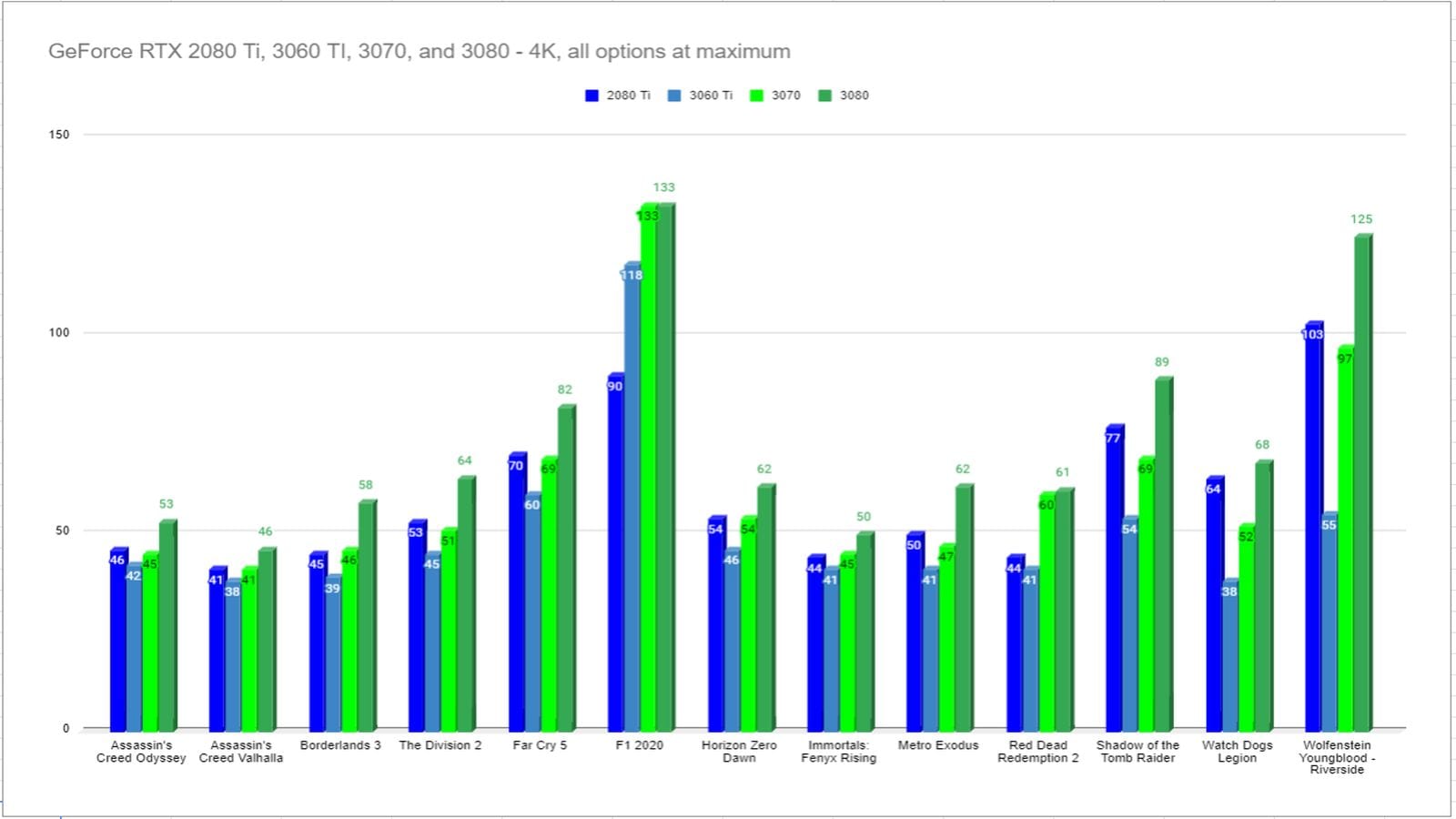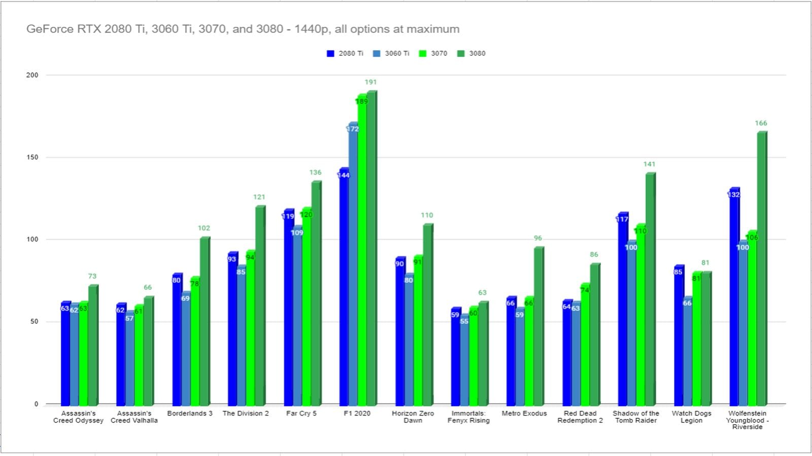 Popping down to 1440p, we see the RTX 3060 Ti turn in some impressive numbers. Every game on our list exceeded, or was within 5 frames of 60fps, with games like Shadow of the Tomb Raider hitting 100fps, as did Wolfenstein: Youngblood and Far Cry 5.