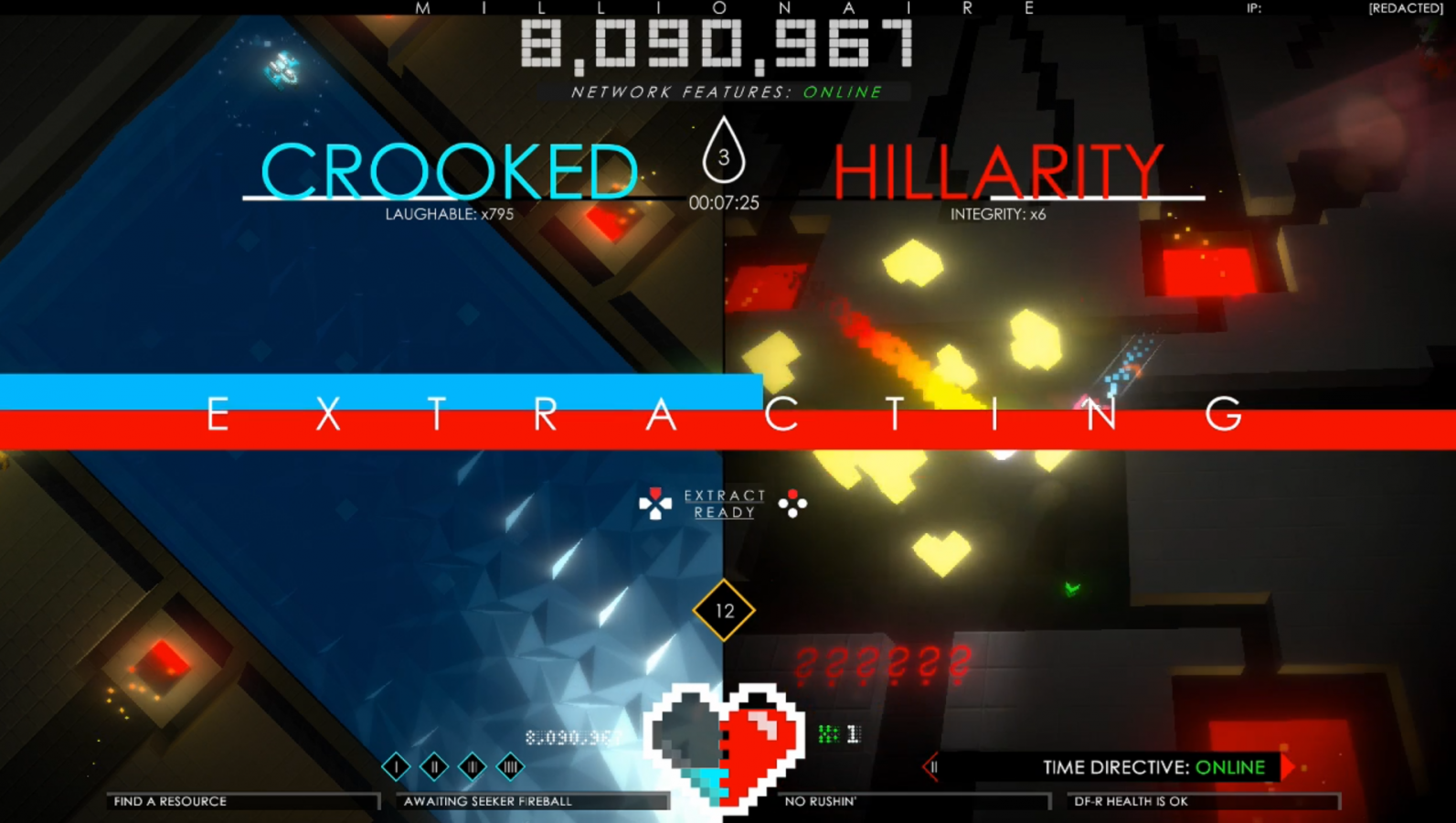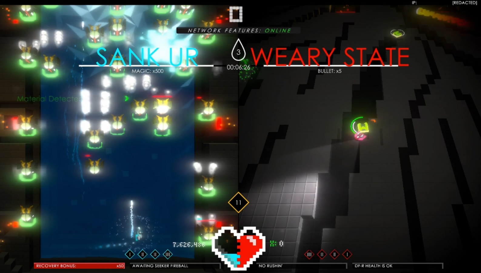 Besides the extraction, parts are important if you want to be able to activate the B.F.P., which is a sonic blast that the right ship can activate in order to destroy all enemies and hazards within a certain radius. Using this blast costs parts, with the cost varying depending on the situation. If you use it to protect yourself from enemies, then it costs three parts, but if you use it to stop the Rushin’ Firewall, then it costs one part. Every four minutes, the aforementioned square of fire, known as the Rushin’ Firewall, rapidly closes in on the center of the right screen. The center of that screen has a square called the Safe Space. In order to push back the firewall, you need to enter the Safe Space and activate the B.F.P. as the firewall gets really close. Doing so will open up the area to explore once again until another four minutes have passed and the process repeats. The Safe Space is also useful because no enemies or hazards can pass through it; in fact, they are destroyed as soon as they make contact with the invisible barrier. At the same time, you can’t stay in the Safe Space too long because the longer you’re in there, the more a meter fills up. If that meter fills up all the way, then the Rushin’ Firewall is triggered early and you have to push it back. This is a nice way to prevent players from trying to hide away in the Safe Space for too long.