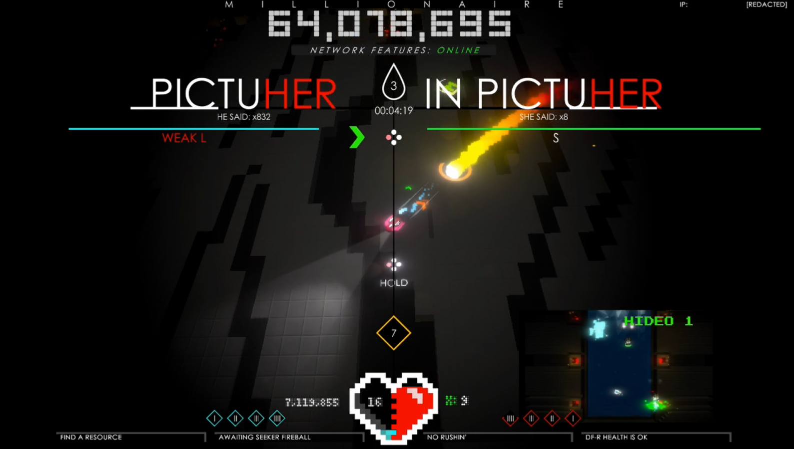 There’s no story to the game, but the point is to accumulate the highest score possible. There aren’t necessarily different levels, but there are three different tears. No that’s not a typo, that’s how the game spells it. I believe that it’s supposed to be a play on the player wanting to cry from the challenge, but who can say for sure? The higher tear that you play on, the more challenging it will be. This comes from more enemy types appearing and if you’re on tear 3, then you also have gameplay functionality changes. On tear 3, the game will periodically throw extra challenges at you in order to make things harder for a limited time. It will warn you shortly ahead of time with a phrase, and each phrase correlates to a specific effect. For example, Himversion and InHersion invert the controls of the left or right ship respectively. Death Sentence puts your right ship in a critical state, causing you to be extra careful for a short while. My least favorite was PictuHer in PictuHer, where the right side expands to take over the whole screen, while the left side minimizes into a small screen in the bottom right corner. Both sections function as normal during this time, but it’s hard to focus on the tiny screen. I appreciate the challenge, but it was the hardest and most annoying aspect of the game to me.