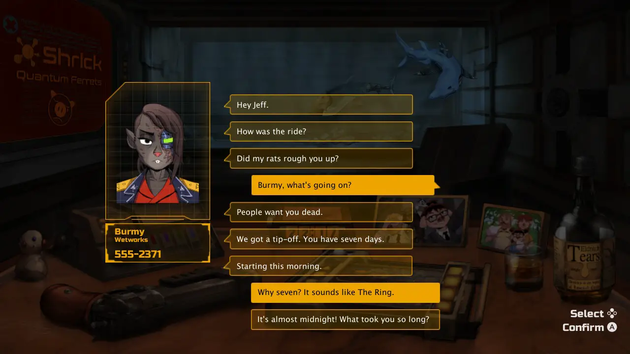 Jeffrey Koch has had a bad day. If it wasn’t enough that he was notified of a mole in his ranks, it seems that everyone wants the Metzgerei gang godfather dead. With only seven days stashed in a safe house from his friend Bumercia (otherwise known as Burmy), you are tasked with ordering her and three other associates to investigate, negotiate, and torture the residents of New Kandinski in order to save your bacon. The game is animated in a comic-book style ala Sly Cooper or My Hero One’s Justice, and the fully voiced intro paves the way for something cool.
