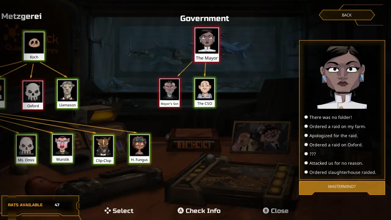 While the main gameplay loop and events remain the same, the objectives don’t. Due to the random roguelike nature of the game, one of your current associates can also be the mole, with another higher-up being the mastermind. Throughout your playthrough, you’ll have to accumulate as many clues as possible in order to find out who’s the mole in your group. Unfortunately, this also means it can be one of your playable crew, but thankfully Burmy will summon some rat foot soldiers to replace them if that’s the case (though this also happens if an associate dies, more on that later).