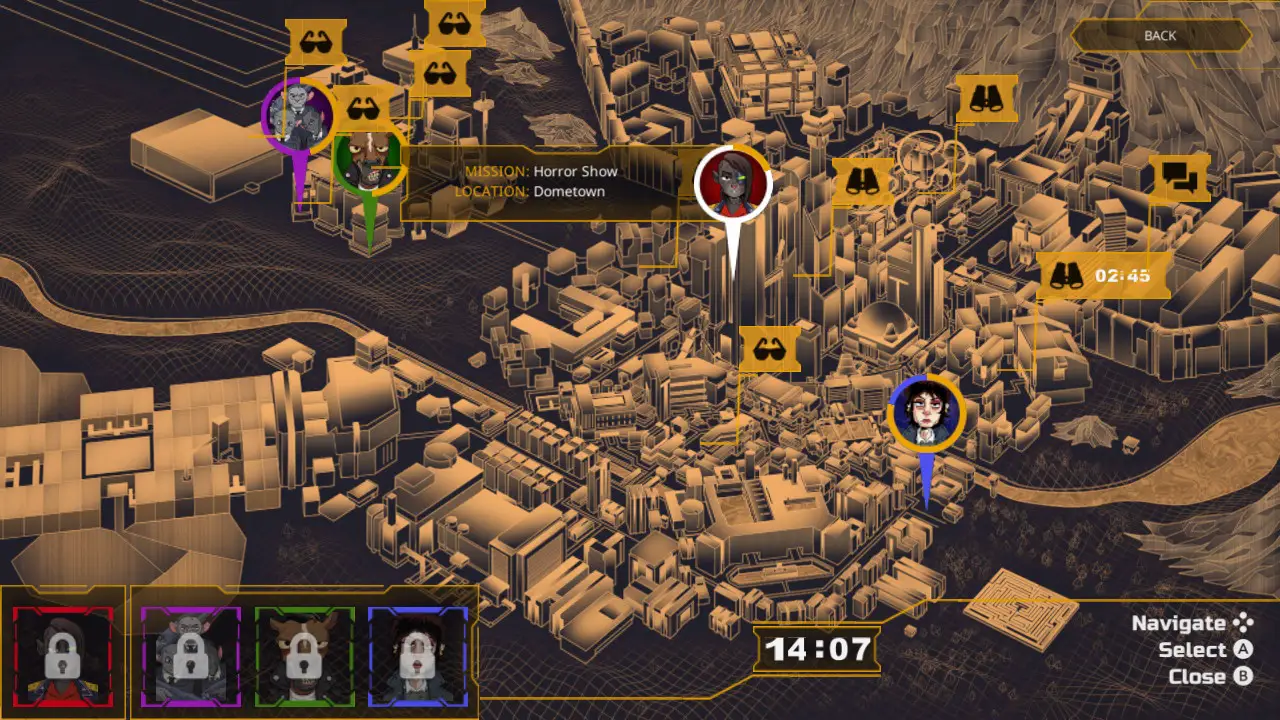 Alas, that feeling passes as you get into the weeds of the main gameplay loop. Thanks to Burmy’s quick action, you’re safe in a bunker for a whole week. A mob boss’s job is never done, however, as you still have to lead your associates to find who is the mole among you. At the beginning of the game you select three other associates, each with their own specialty, as well as Burmy in order to explore the city of New Kandinski. By responding to prompts and clues that pop up periodically, you can assign one of your associates to investigate; after a while, the game determines whether the encounter was successful or not. By succeeding in these missions, your associates can gain clues and even new contacts or leads which will update your Schrick board; this is your encyclopedia of events that have occurred and member relationships to each other.