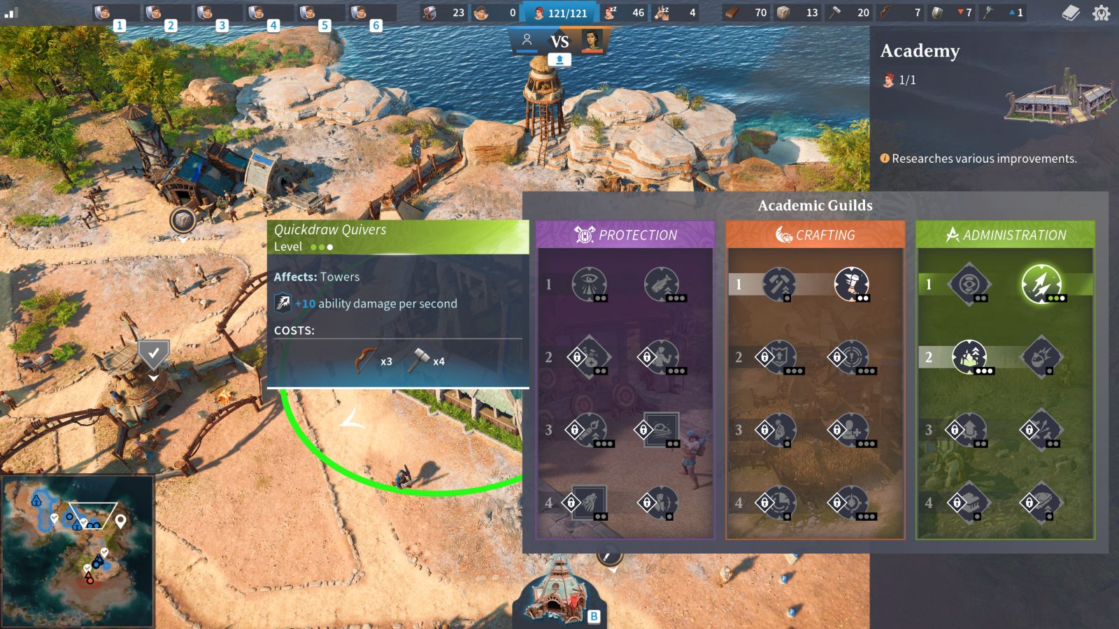 What good is a massive settlement if it’s unprotected? Naturally, you can build an army. Your choices here are severely limited, as you only have three troops to choose from, plus one faction-based bonus unit. They’re very generic; a defender who has more health than damage, an attacker who has more damage than health, and an archer who has lower of both, but can fight at range. There are also two types of mages, but they’re just archers who do more damage to buildings, and there’s also a healer. Overall, there’s not a lot to play around with. Compare that to an RTS like Supreme Commander: Forged Alliance, a game that came out in 2007, which has dozens of units, and every faction has a unique variant and gameplay style. The lack of units in The Settlers: New Allies leads to a distinct lack of strategy, it almost always comes down to whose numbers are bigger. Defense isn’t all about having an army, you can also build a few defensive structures. There are two towers, one that attacks in an AOE, and one that heals your troops. On top of that, there are also fake soldiers who taunt enemies, thus rendering them useless for a short period. That concludes the list of defensive options, three total. Despite the small number of options, they’re all you need, given how maps often have choke points, you can turtle hard in this game. There’s also a research tree, but a good deal of the perks just increase stat numbers.