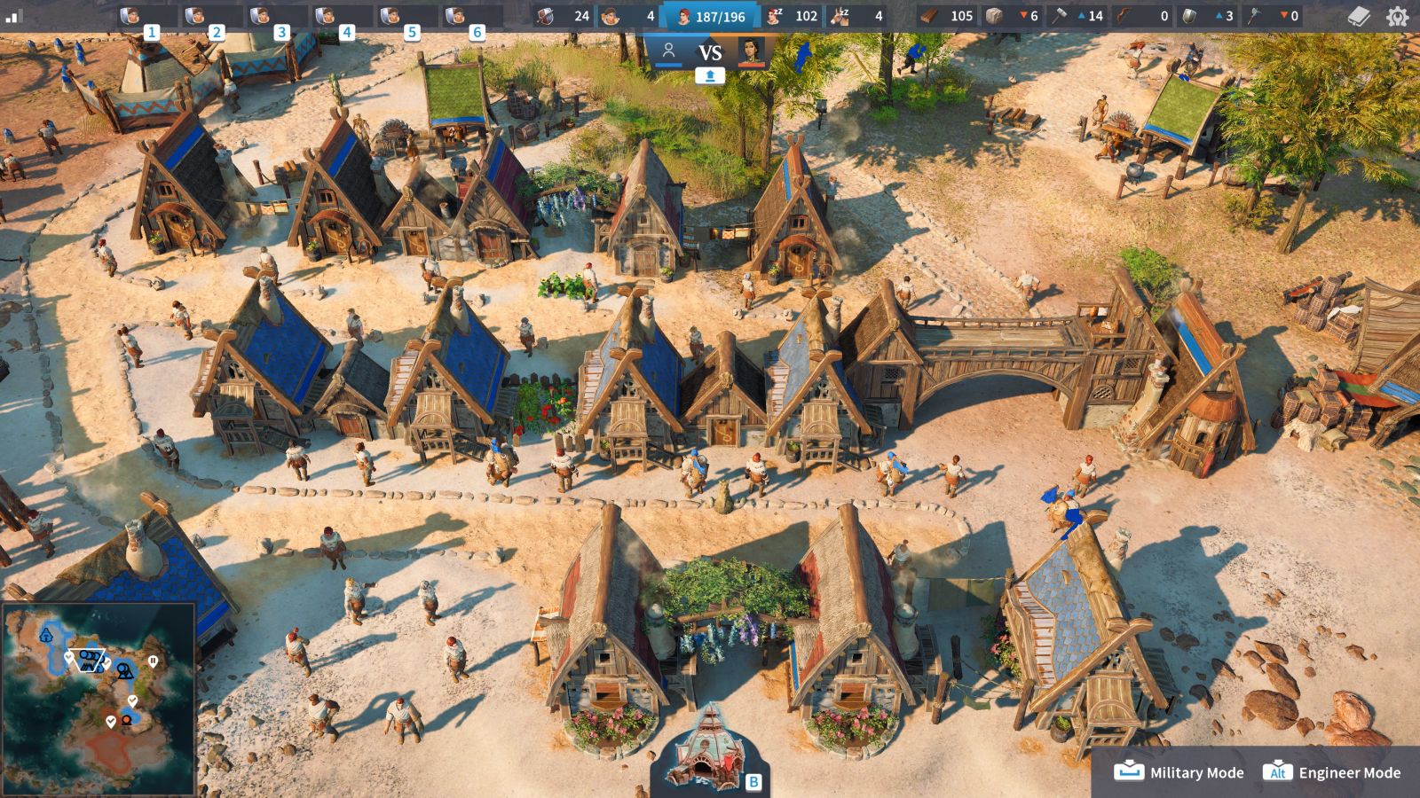 Many buildings can have their production boosted with select products from other buildings. For example, you can give the blacksmiths meat to make them produce goods faster, but that means fewer donkeys to carry the goods around your settlement. This can provide a semblance of strategy to skirmish encounters. What do you want to target, and how will it destabilize your enemy’s resource economy?