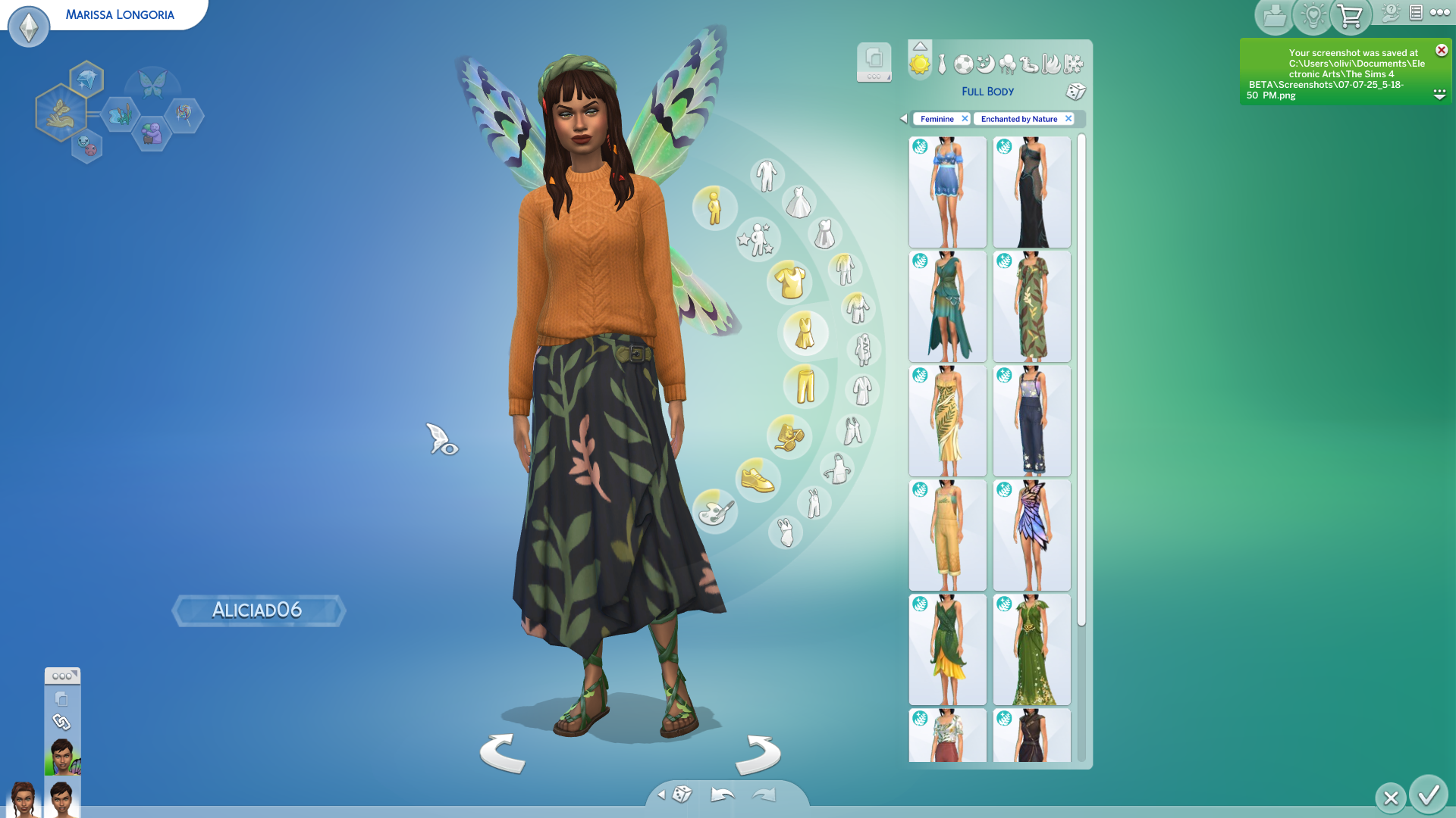 We’ll start off with CAS as it was the biggest and greatest surprise I had with playing Enchanted by Nature. I knew we were getting fairy, but the range of outfits on offer are a treat. There are so many floral gowns and t-shirts, cute jumpsuits and dungarees, and whimsical headpieces and leafy pencil skirts. There’s a lot here that I know I’ll be using in all my playthroughs as it fits my vibe perfectly. I’ll include photos below of my young adult and teen Sim, but I’ll also mention we have some cute outfits for toddlers and one or two things for infants. We also have a few hair options that include leaves stuck in your locks and highlights in your wavy ponytail. Any fairy lover will have a blast creating a Fairy or even just a normal Sim with these options. However, a word of advice, when you’re creating female framed Sims, turn off the Feminine tag as it hides a lot of options that would look more than fine on your female Sim – definitely some tagging that needs to be altered as you could end up missing out.