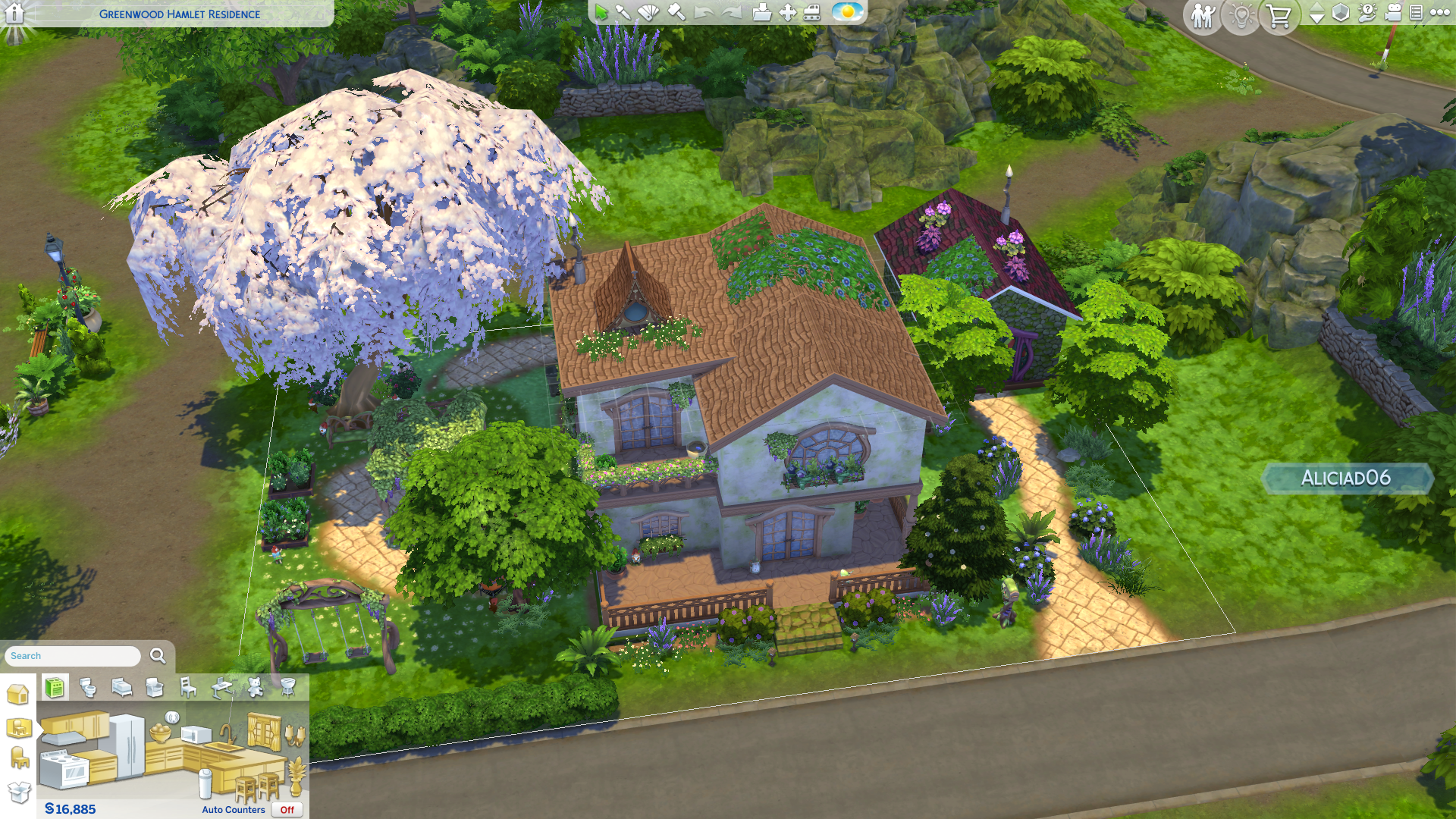 Finally, and certainly not least, is build mode. There’s a lot to unpack here so I’ll keep it brief. I’m staring at the word count now and realise I may be yapping . Build mode includes furniture in most categories, most notably in the doors and windows category where you can pick a more natural wood and glass paneling look or go full fairy cottage core with mismatched colorful windows. Both options pair well with the range of furniture you can choose, often leaning into either aesthetic. You have beautiful thick wooden desks, bookcases and fireplaces that come in a range of colors and patterns, an enchanting rug whose each swatch has its own emblem, from unicorn to griffin and more mystical furniture that incorporates glowing stone and mossy stone, like the shower and bath. You also have a bunch of floral decorations that hang off furniture and can wind up your walls, and amazing outdoor furniture that makes you want to build a whole garden. Finally, otherwise I’ll be listing at this point, we have gorgeous kid room items, from cribs to toys to tree bookcases. The building has never been so cozy and pretty to engage with. I spent hours in the house pictured below, and I could easily spend more time making other homes. My only gripe is that we didn’t really get many plants, ironically. We got a few outlandish purple shrubs and other things, but we didn’t get any new pond décor or many outdoor plants. Since the base-game update, we can place certain plants on roofs, which creates a really nice aesthetic. But potential seems to have been missing here, and trees and other bushes are locked to debug.
