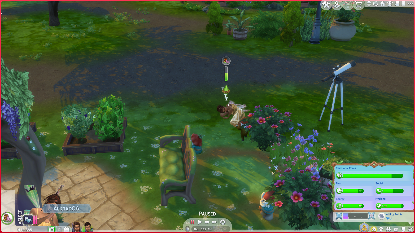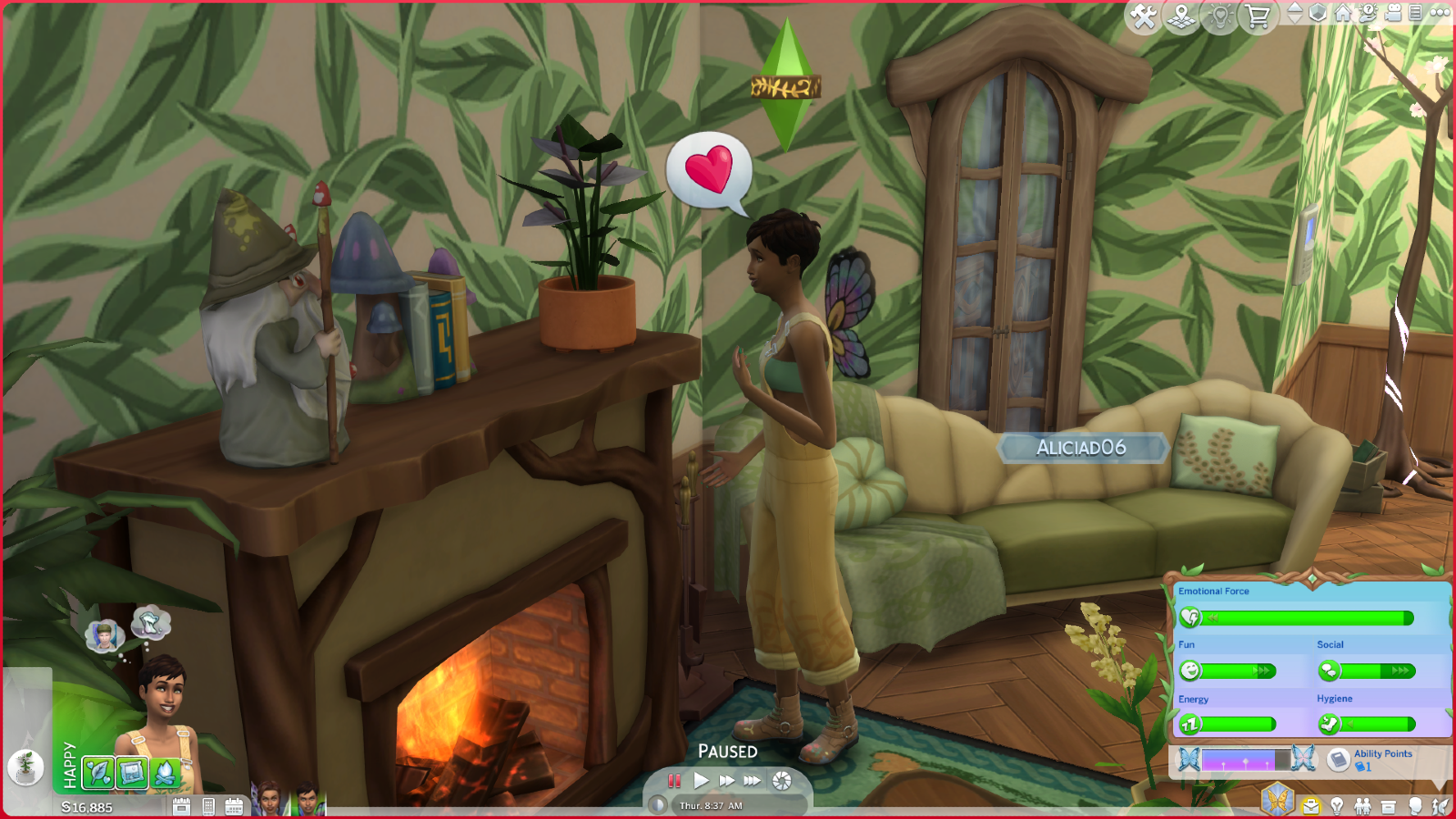Fairies have a range of abilities to have fun with, from being able to instantly fly anywhere, shrink and play with any household objects and retain emotional force. Instead of having to manage your bladder and your hunger, these are substituted with a long emotional force bar, which you can use to do more complicated fairy actions. It’ll deplete like your other needs and can be replenished by absorbing another Sim’s emotional force or spending time in a fairy house. This meant that there wasn’t really a purpose for a toilet and a kitchen in my fairy playthrough and I found Sims didn’t need to be coddled so much. But I was sad when I realised my gorgeous cottage-core kitchen was purely decorative. This needs to be monitored however, as if you become emotionally starving, your Sim can die. This is one of the new deaths in Enchanted by Nature, but don’t worry, it’s not that easily achievable. It acts like your hunger stat, and starvation in The Sims 4 takes a lot of time to kill you off. You’ll also be notified if your energy is too low, so it’s fairly basic to manage.
