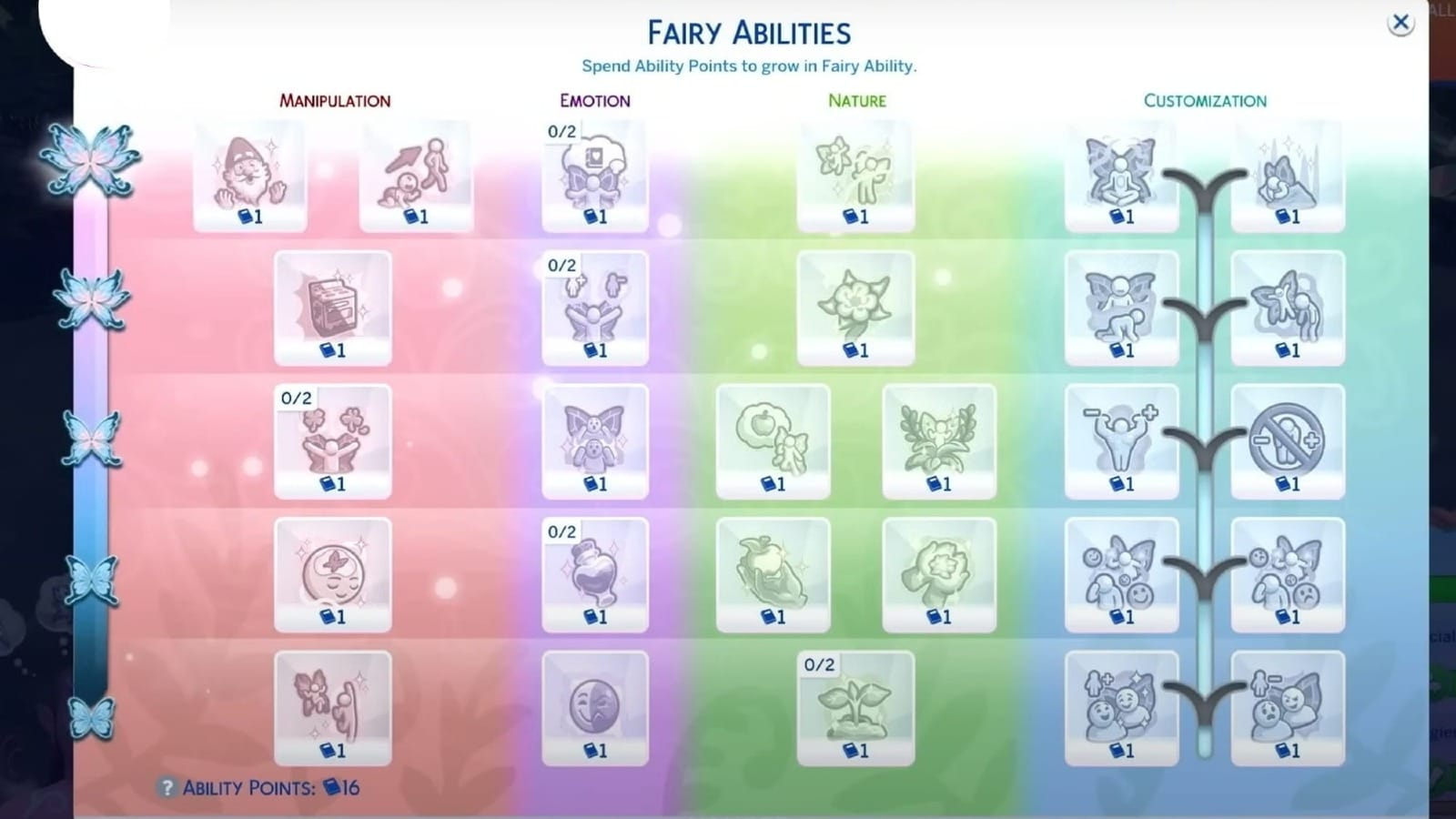 Focal to a new Sims occult pack is the skill tree you can use to gain unique skills and customize your Sim’s personality. The Fairy skill tree is separated into four columns, Nature, Emotions, Manipulation and Customization and each gives you new skills to be purchased through points, which you accumulate as you do general Fairy biz. For example, you can make it so when a Fairy gardens you harvest a duplicate seed, or you can sway other Sim’s emotions. I won’t spoil many of the skills because some of them get wild but remember that these skills cost varying degrees of emotional force, with more powerful actions practically taking up 90% of the bar.
