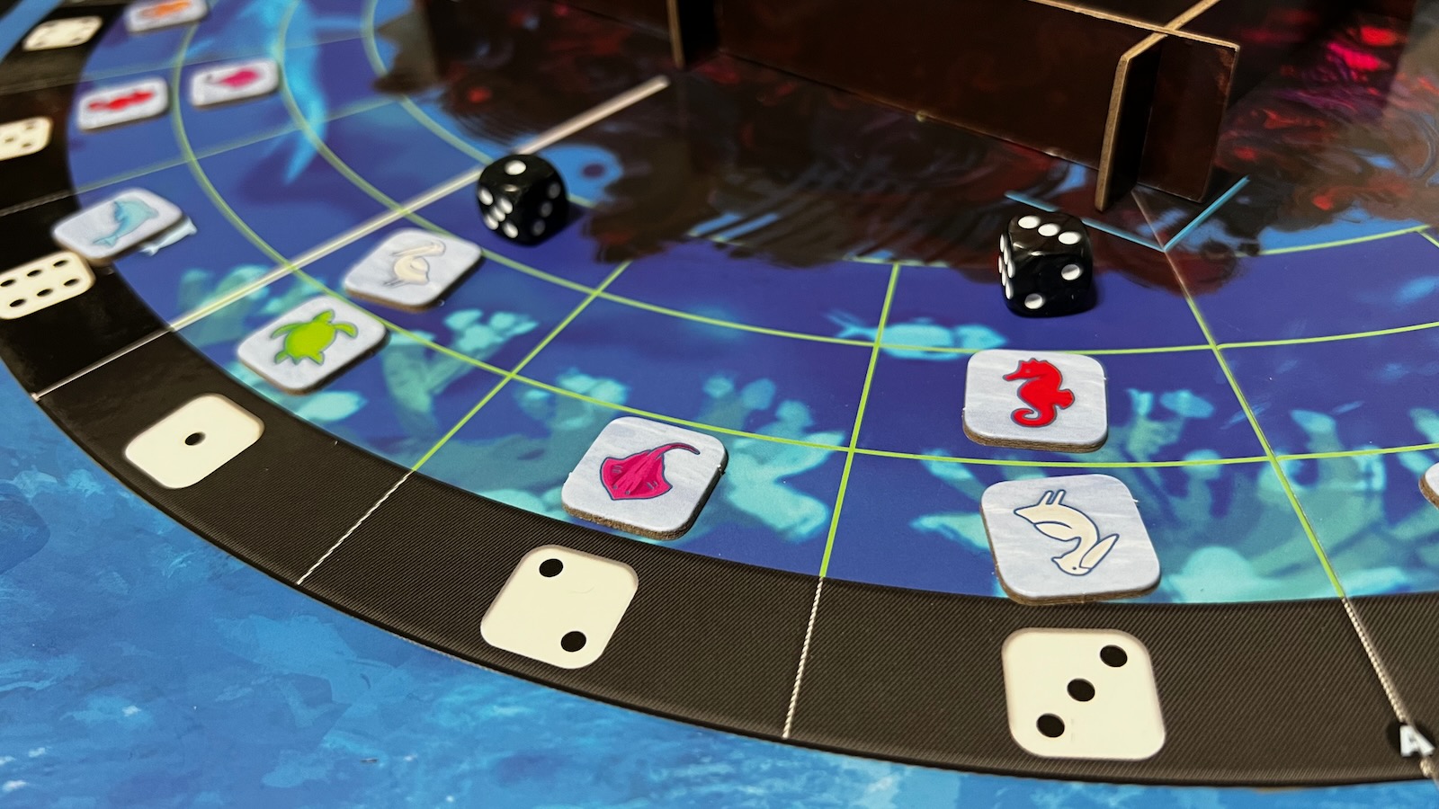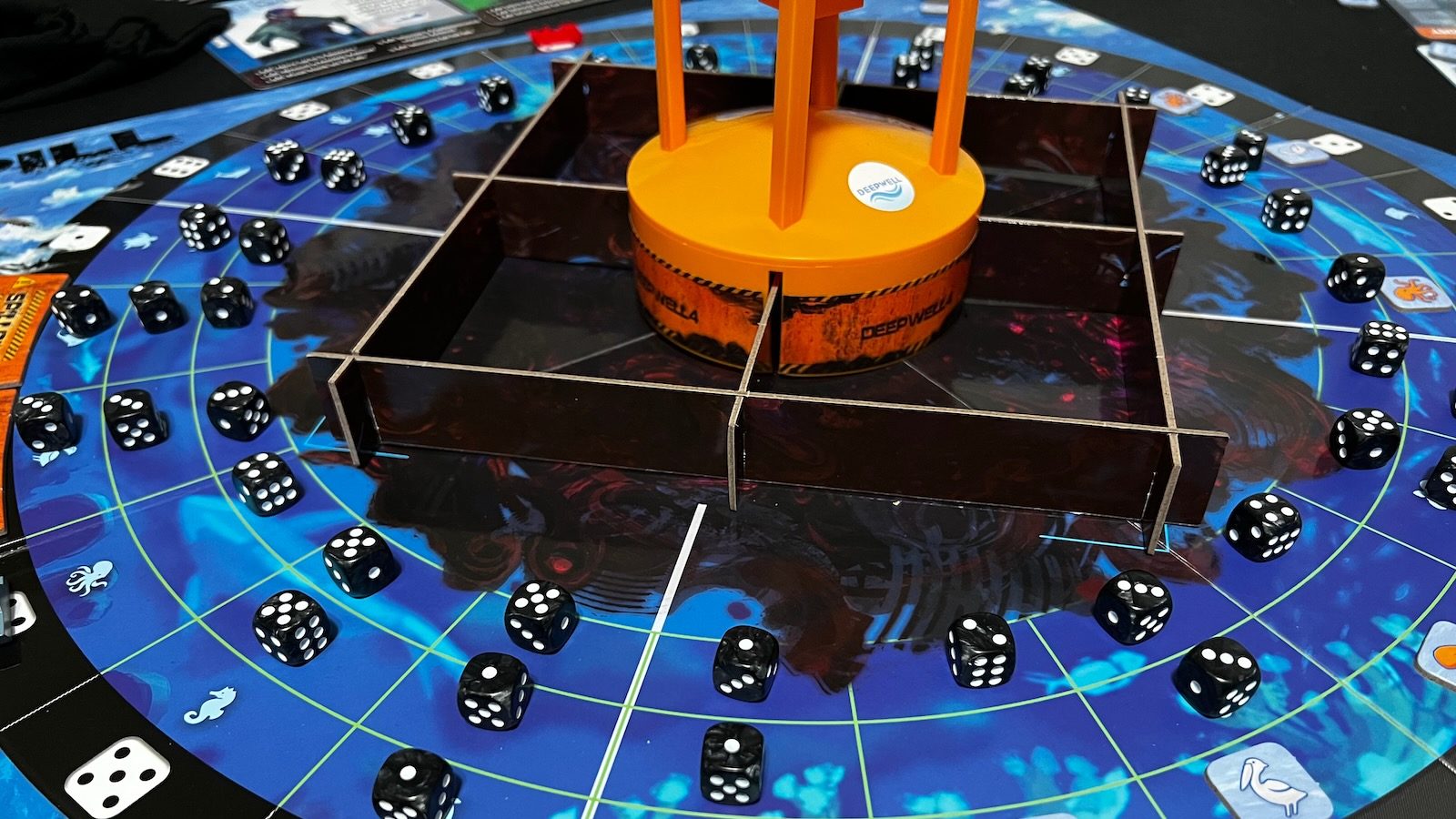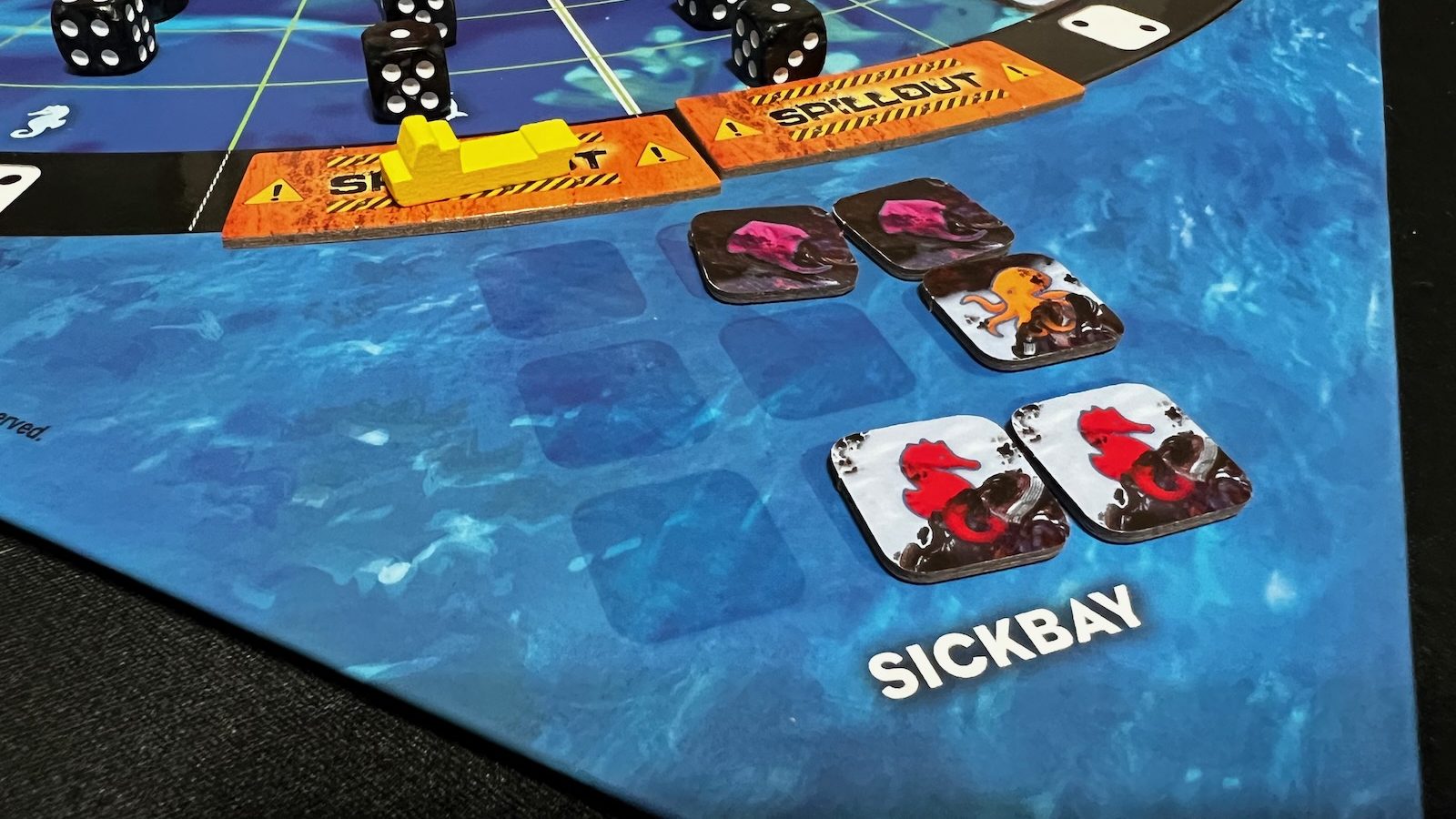In the middle of the playing board sits a large Oil Rig dice tower called DeepWell-4. To simulate oil, players drop black dice into the top of the oil rig tower that will be distributed to different quadrants of the board. Each quadrant is divided into six sectors with three spaces apiece. Some of these spaces hold sea creatures that come in six different species. As the dice are rolled, they are placed further from the tower. Sectors that have all three dice spaces filled trigger a “Spillout,” which can lead to one of the losing conditions if six are present at the end of a player turn. The Spillouts will also increase a tracker indicating the number of dice thrown each turn. When dice touch an animal, the animal is contaminated. If not treated by the end of a turn, the animal is sent to sickbay which effectively removes them from the game. Having one of each animal or three of one kind of animal in sick bay are the other two ways to lose the game.
