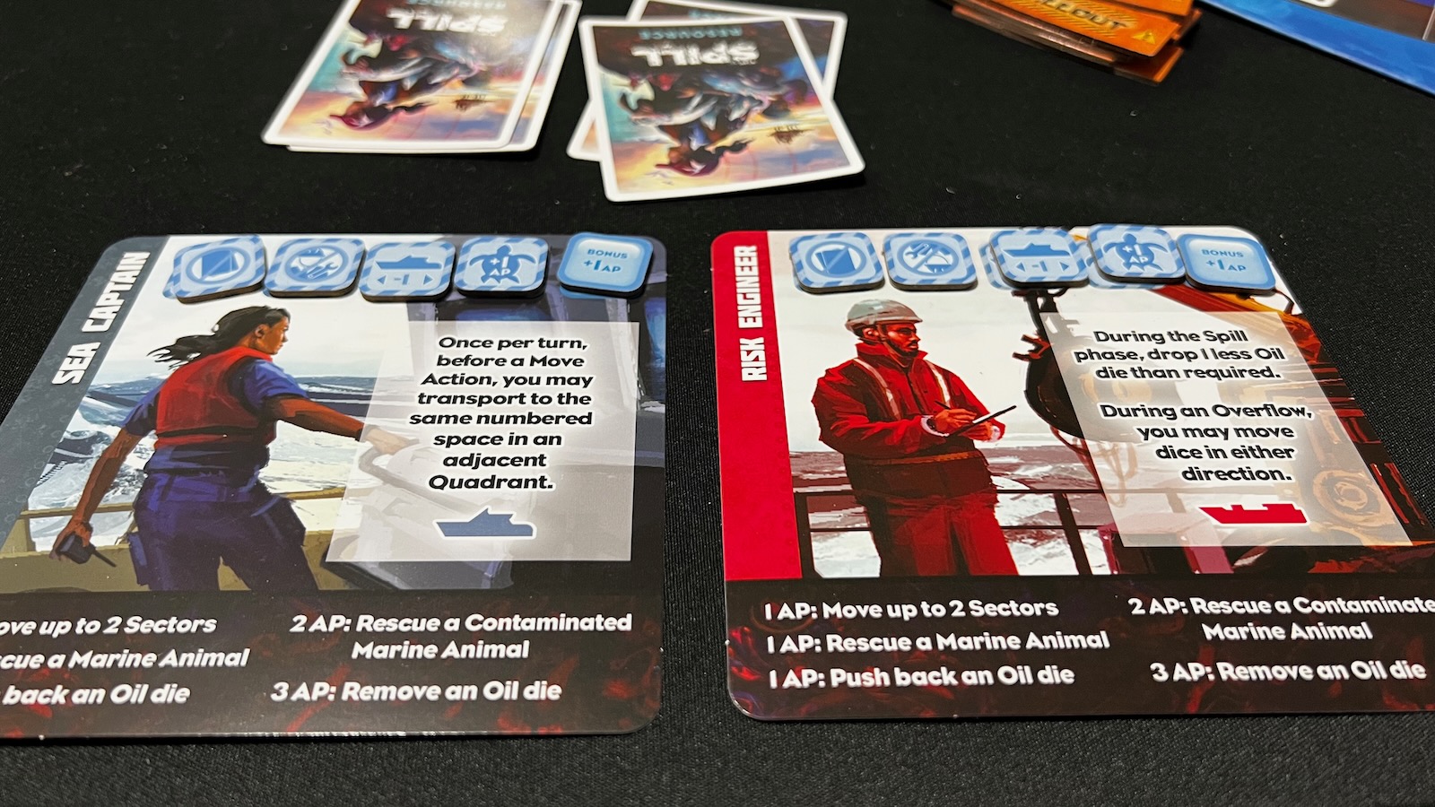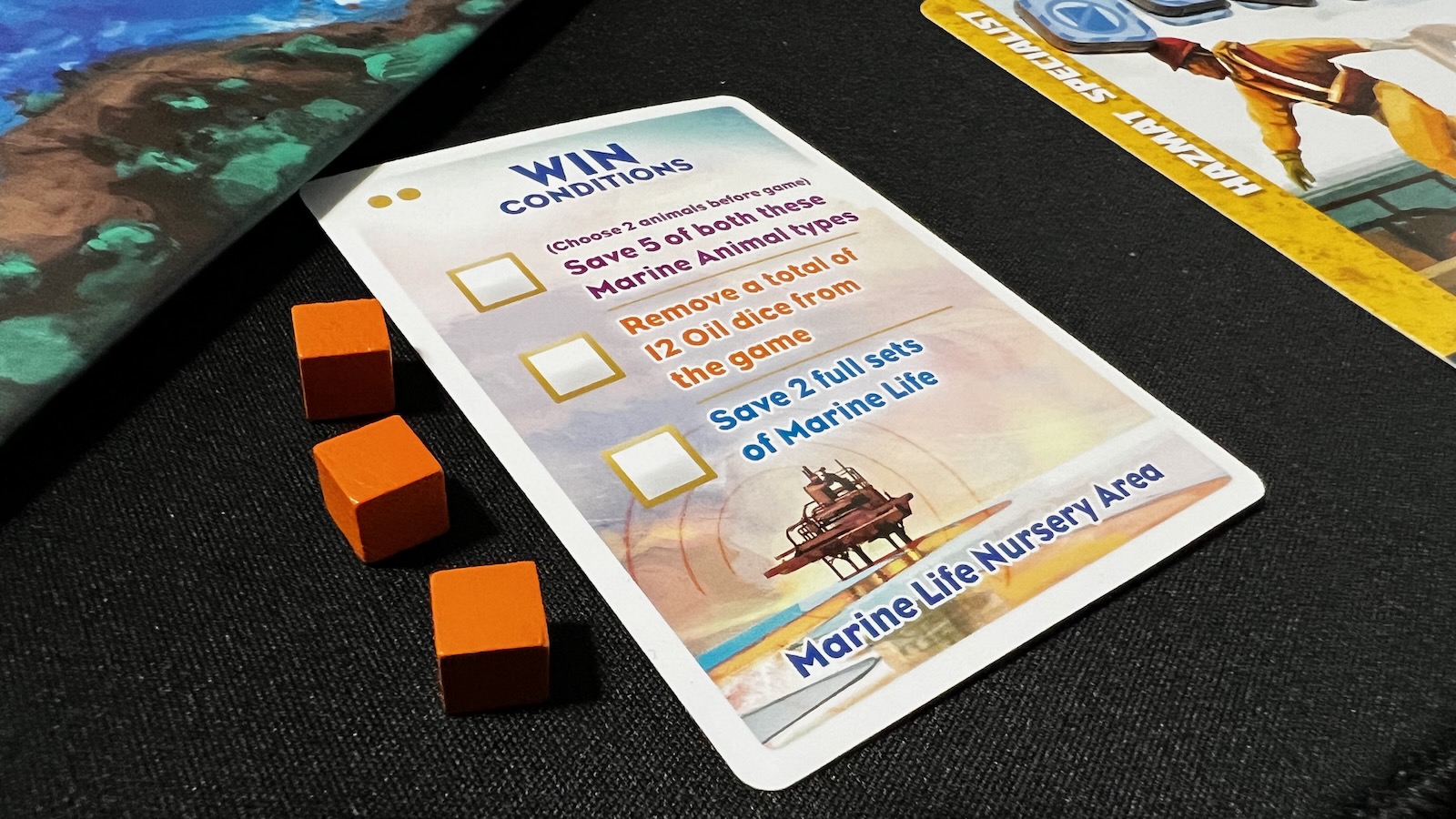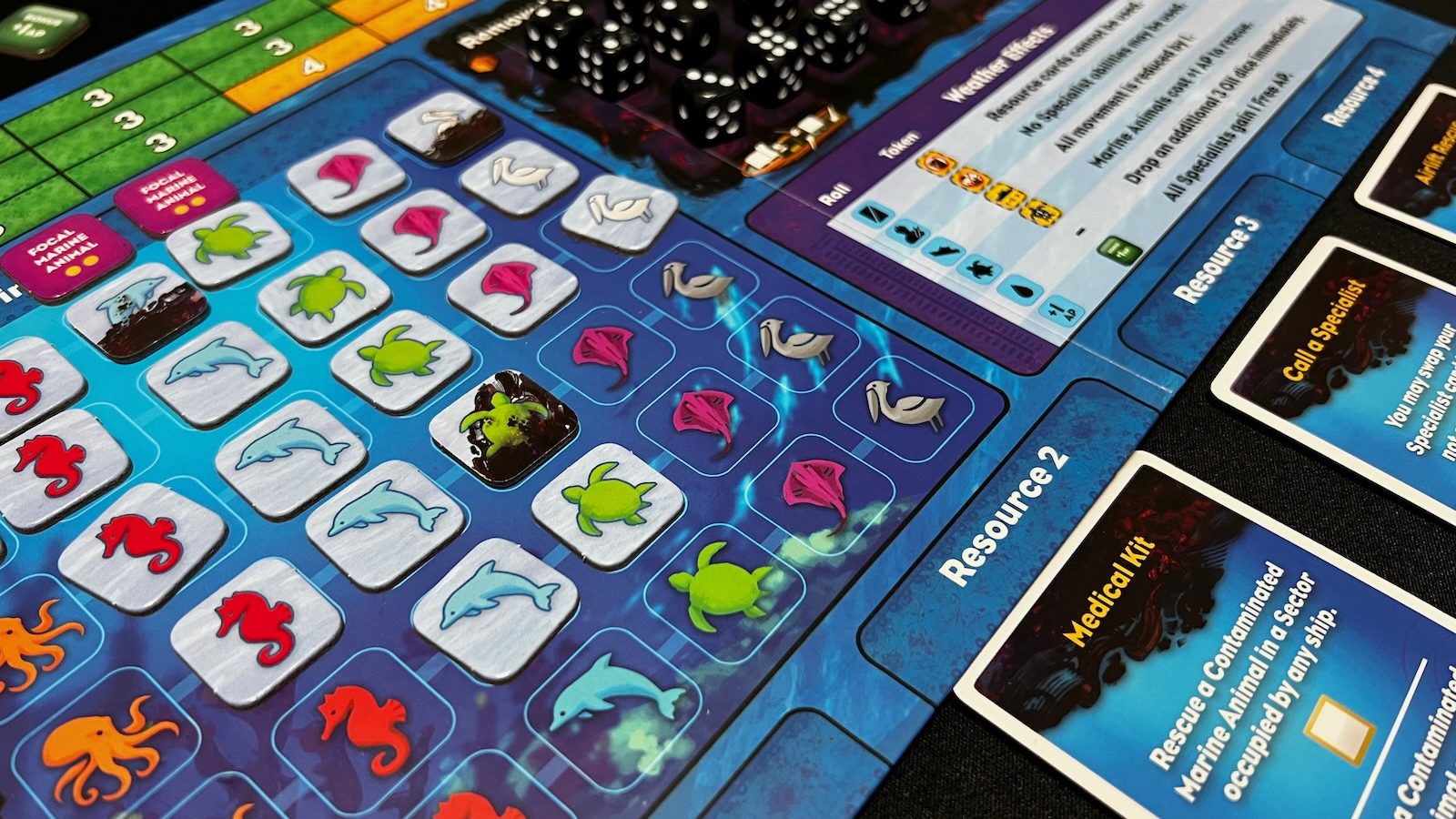 Apart from the basic actions that each player takes, there are other helpful resources available. Every game, independent of player count, will utilize four specialists. Players can choose their specialists each game or choose at random, but each specialist comes with a special ability. Some allow for easier oil removal, some make rescuing animals easier or cheaper, and some allow for specialized movement. Another helpful tool is the resource card tableau. As players remove dice from the game and rescue animals, they can earn orange resource cubes that are placed on a set of resource cards. These cards can be used by any player throughout the game if the requisite number of cubes are placed on the card.