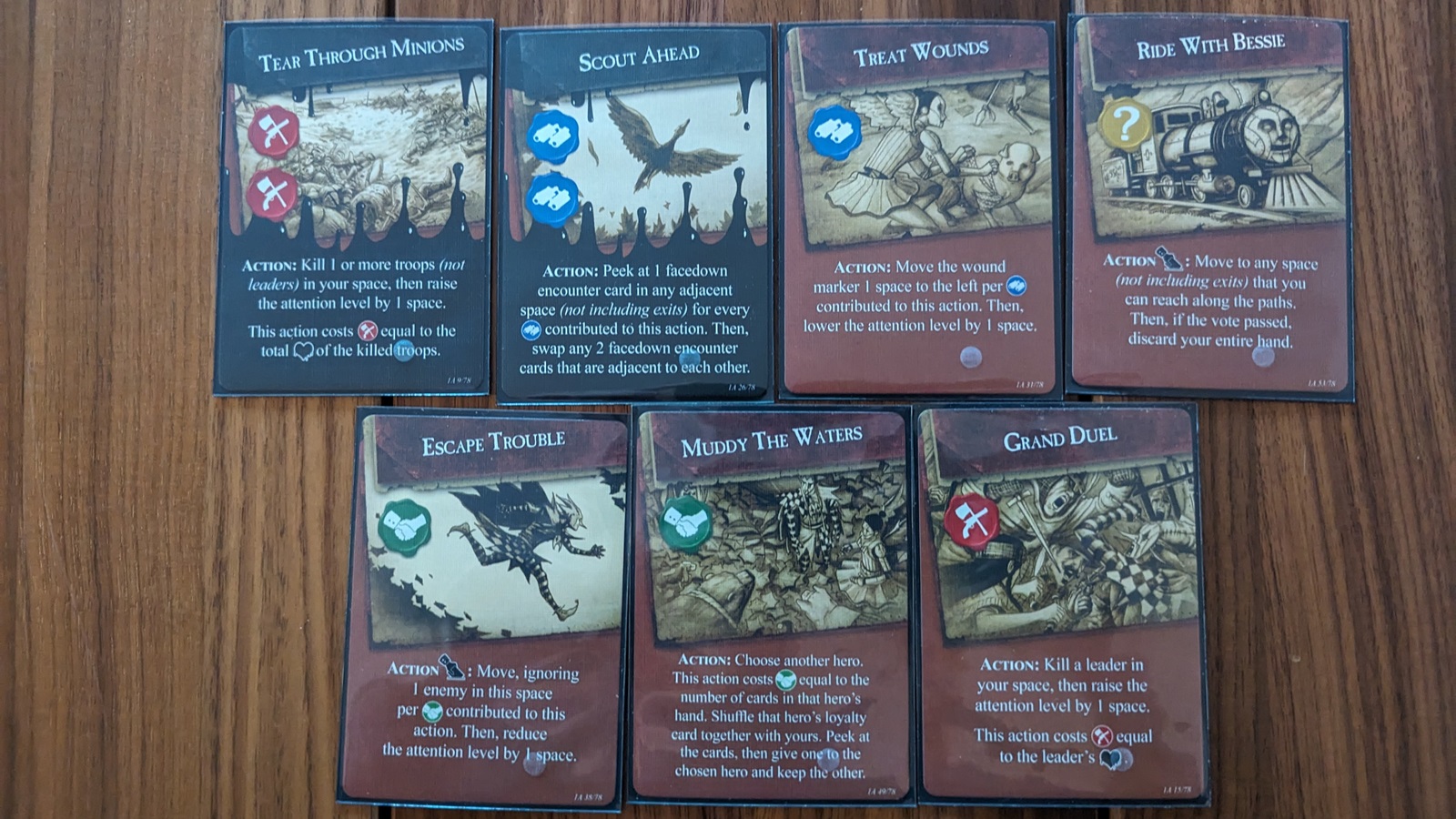 While the two previous actions are important, the core of the game is playing cards for their actions. Cards can be played for an action, or used to boost an action. There are four different skill types of cards: talk, fight, scout, or wild. A player can use the specific action on a card such as fight minions or scout adjacent locations. For their action to be successful the player will need a certain amount of skill icons for that action. That player can further boost their action with more cards of the same type from their hand or ask other players for help with cards from their hands. Further complicating this is that some action cards are “stained” and if these cards are played into an action they will trigger a character’s negative trait. Each character has a positive and negative trait that helps and hinders them throughout the game.
