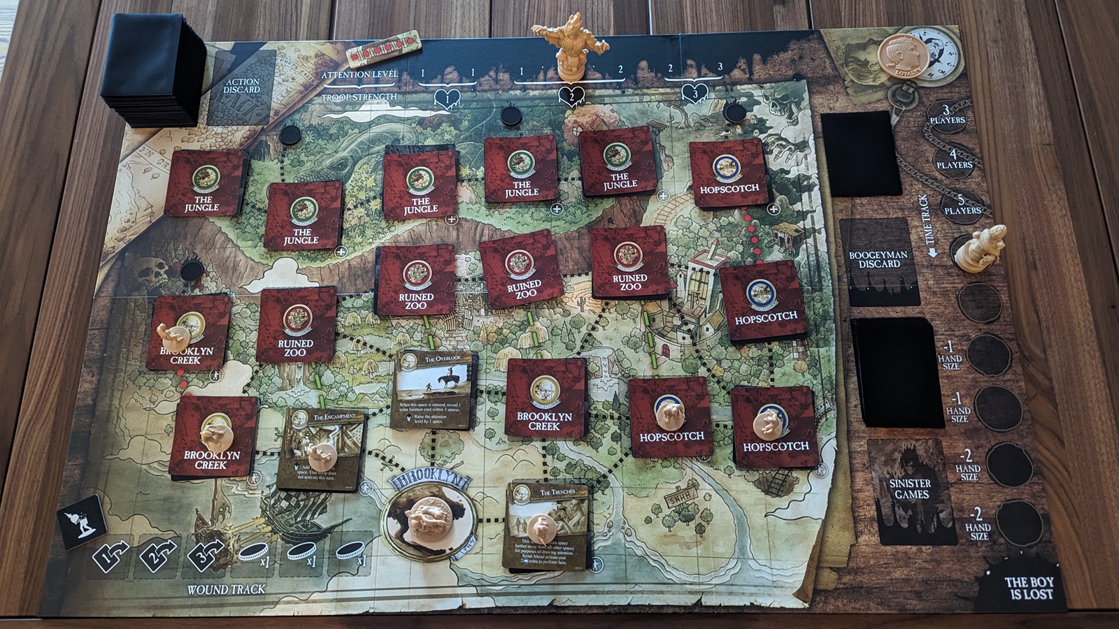 The actions players take always cost cards. Players begin the game with a hand of seven cards and whenever a player runs out of cards they must flip the Boogeyman’s coin which can either push the The Boy is Lost track one space or draw negative cards from the Boogeyman’s deck. This coin is the timer on which the game runs as even with a 50/50 chance eventually The Boy is Lost track will run out. The actions players may take include: move, hide, play a card for its action, or discard a card to skip their action. Moving always causes the players to vote on the nominated space, preventing any one player from taking the group somewhere the others don’t want to go. Hiding reduces the Boogeyman’s attention track by one space. This track determines how hard enemies are to defeat and how many spaces away enemies activate.