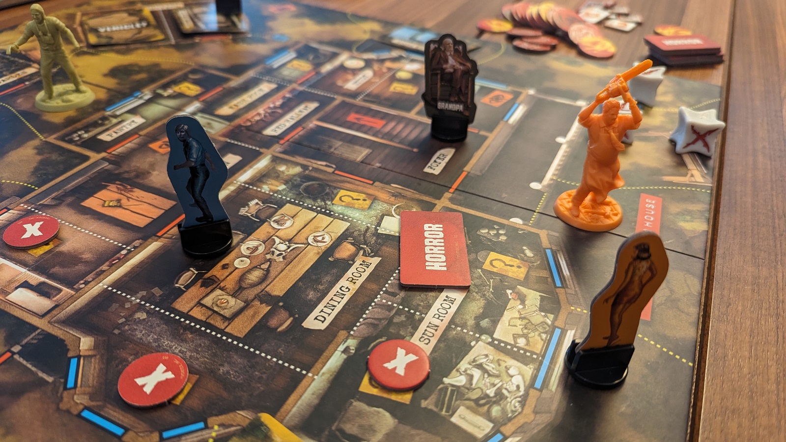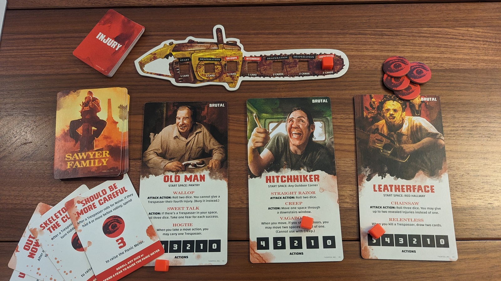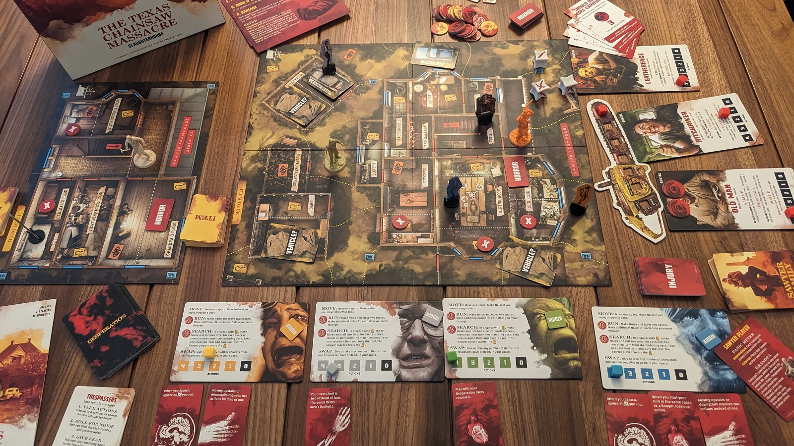 There are some other smaller mechanics in the game such as Desperation cards for the Trespassers. At certain points on the Panic Meter the Trespassers will get to draw one Desperation card, these are powerful one time use cards that could help a Trespassers player out of a jam. These cards seemed to be all over the place in terms of actual usefulness though. Sometimes players had exactly what they needed and other times Trespasser players couldn’t make use of them. Horror tokens are placed on the board at the start of the game. When a Trespasser enters the space with one the token is flipped up and resolved. Most of them are bad for the Trespasser players and add another small hindrance on to the pile. There are also certain spaces where Trespassers can hide making them harder to attack should a Sawyer arrive in their space. One small, but nice touch is that Trespassers start with one personal item that gives them an asymmetrical power helping to differentiate them from the rest.