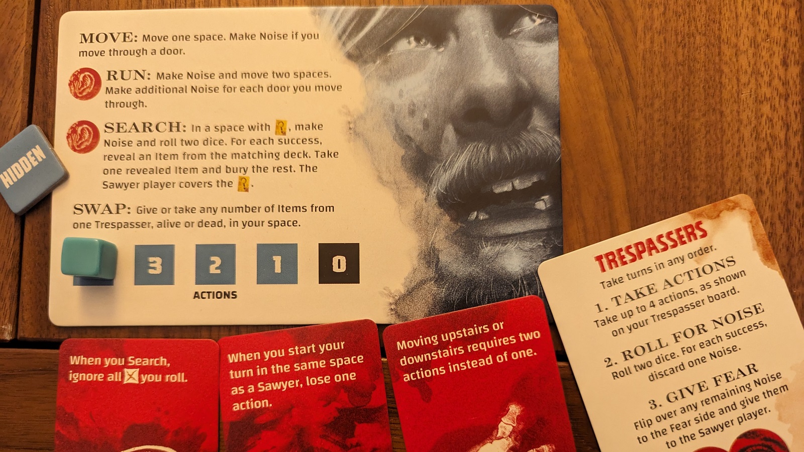 One interesting mechanic I’d like to touch on is the damage system. If this has been implemented in other games, I have not come across it yet. A Trespasser dies (and is out of the game) when they have received their fourth damage card. The big caveat is that there are four types of damage and you cannot have the same type of damage more than once. This means as you are more injured you’re harder to actually kill. Whenever an attack is successful, for each success the Sawyer player draws one damage card and then assigns one card to the Trespasser if able. I found this to be a neat innovation and sometimes Trespassers would survive several attacks since damage couldn’t be assigned to them. Other times, this didn’t protect a Trespasser at all, but if we were flipping cards for someone’s last damage, it was always dramatic.
