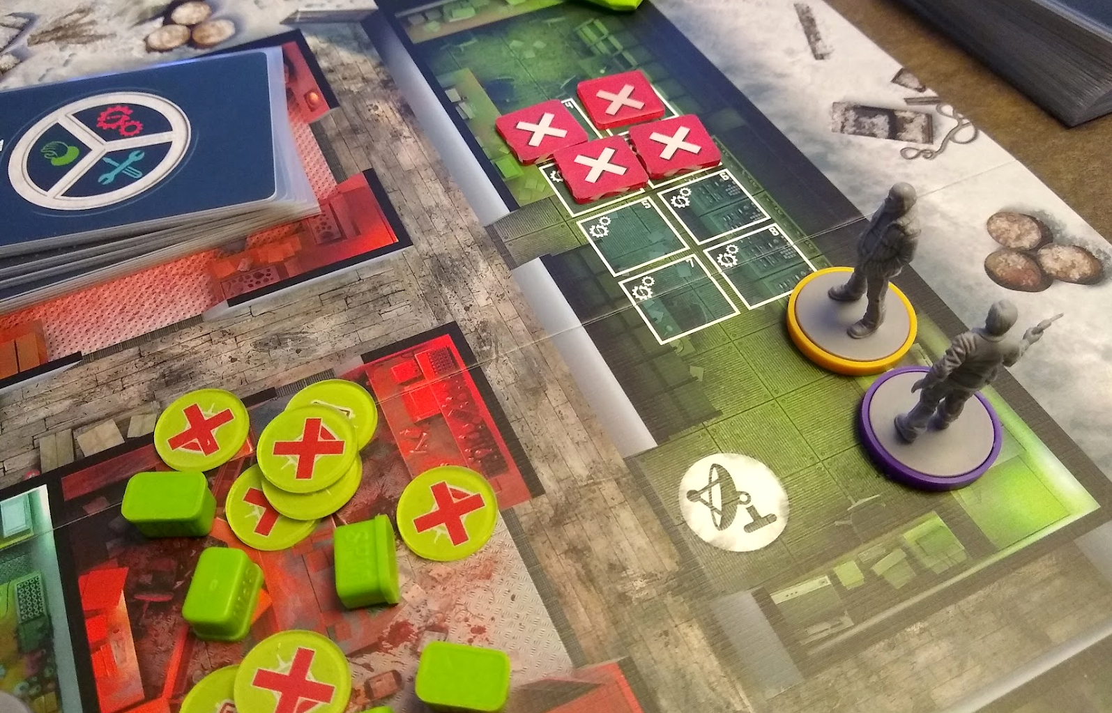 Lastly, I’d like to talk about the components for the game. While I have played with the upgraded Kickstarter edition, I don’t think any of the upgraded components are necessary. The cardboard standees have a nice color to them compared to the gray miniatures. Though I’m sure if a skilled painter worked on the miniatures they would look amazing. The upgraded tokens are a mixed bag… The lab, damage, and dog tokens are all great, but it turns out the upgraded player contagian tokens can reflect light (depending on your table) and actually give away which one of them is the alien token. While this isn’t a big deal, it is something our group noticed and had to be wary of when we were doing contagion checks. The components for the game are otherwise beautiful.