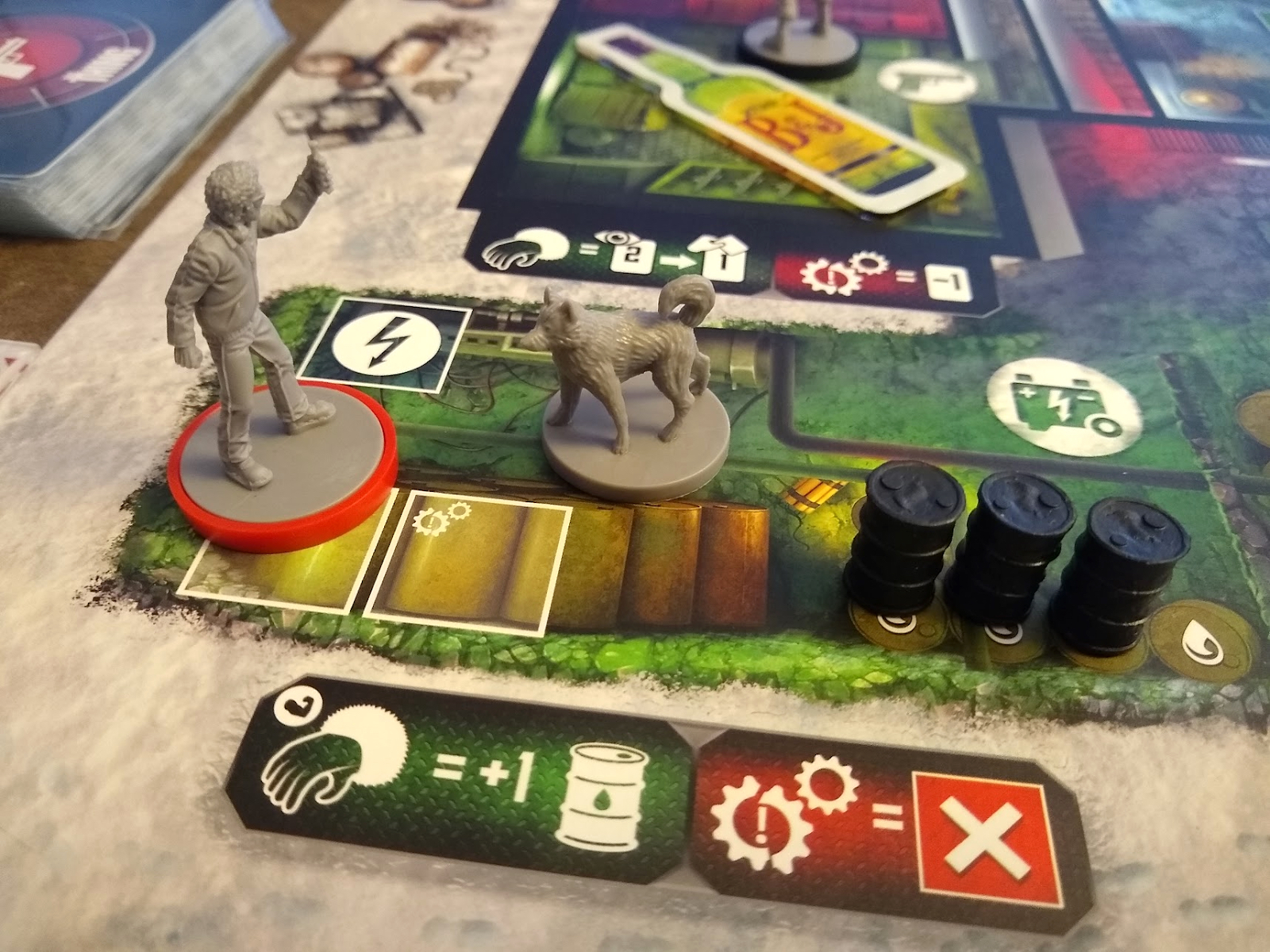 Though the leader, weapons, and the revealed alien player were the mechanics our group placed at the center of our debates, there are still a lot of other small mechanics running around the game too. At the beginning of a round the Leader will roll a weather die and this will determine how much fuel the base consumes that round. This is a small amount of randomness to how often players have to spend their actions refueling the power systems in the base. There are dogs(?) that move around the base and if you are caught alone with one you may change to the alien team. While they can be caught to remove their risk, this requires some teamwork and trust between players.