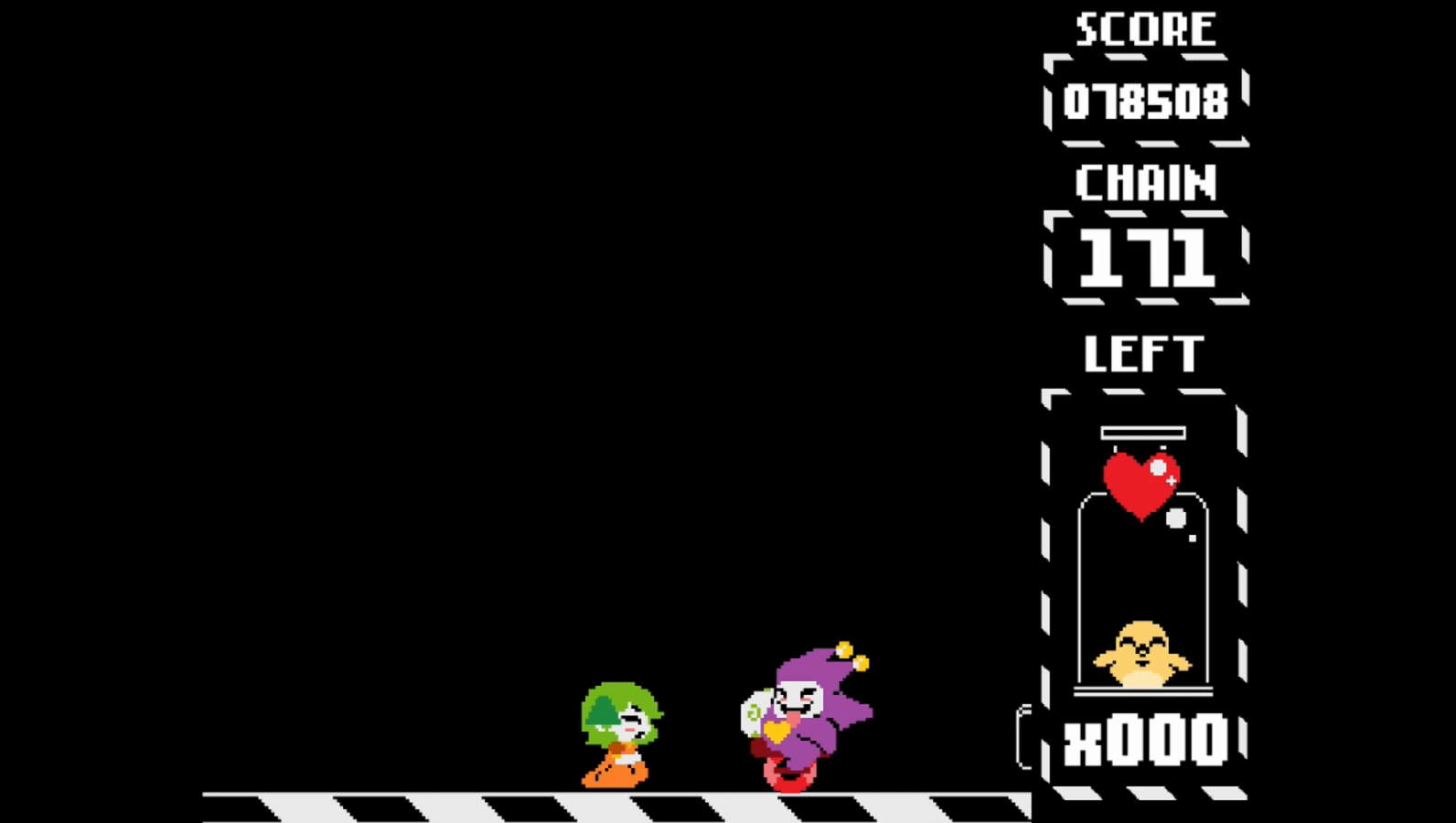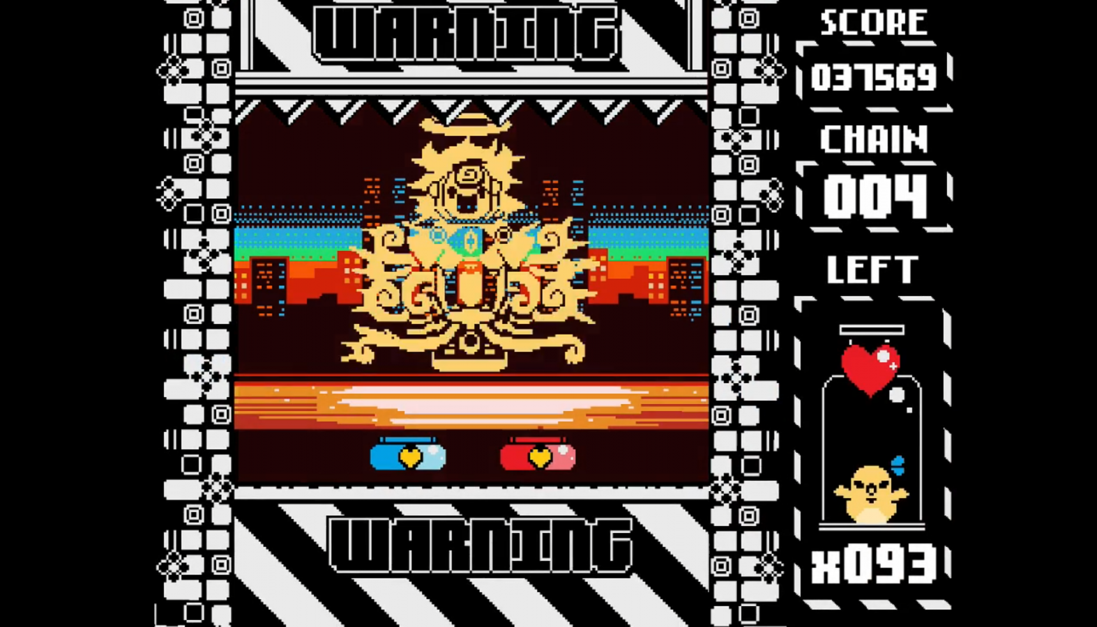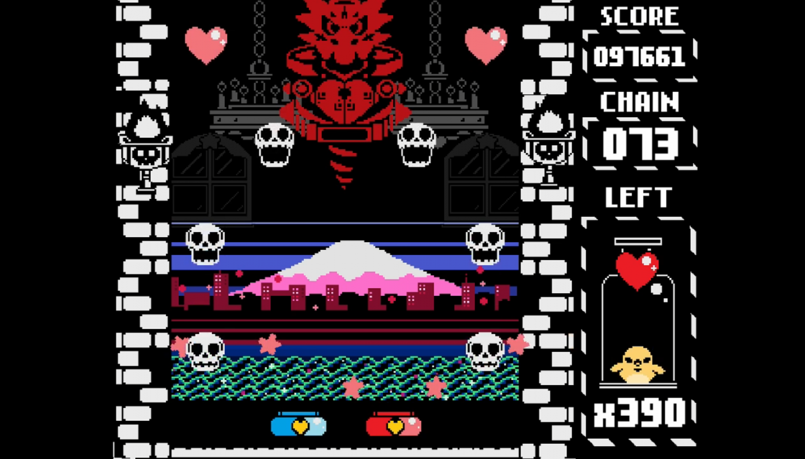 Both ships start off side by side in the middle spots on the bottom of the screen. These spots are the only places where your shots can hurt the boss, so you’ll want to keep them there as much as possible. Each ship has another spot on its other side that it can move to with the press of a button. As you play, hearts, dust bunnies, and skulls will randomly come down from the top of the screen towards the bottom. You need to collect the hearts because every time a heart hits the bottom of the screen, all on-screen projectiles fall away and spikes at the top of the screen slide closer to your ships. The same punishment results from missing dust bunnies, but dust bunnies need to be knocked away instead of caught; you do this by moving to the space next to it and then sliding at it at the right time to knock it away. If your timing is off or they hit you directly, you lose one of your three hearts. Skulls thankfully don’t cause the spikes to move when they hit the bottom of the screen. They need to be avoided entirely or else you’ll lose one of your hearts. As with the hearts hitting the bottom of the screen, getting damaged also causes projectiles to fall away.