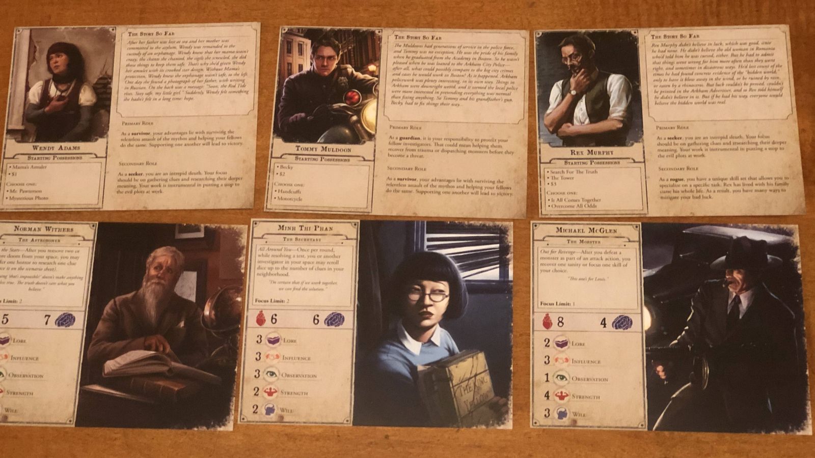 Twelve investigators come included in Arkham Horror. Investigators have different values for health, sanity, lore, influence, observation, strength, and will. Health and sanity indicate your physical and mental well-being, while the other attributes get used for checks during encounters. These attributes are set, so those used to switching the loops in the Second Edition won’t have to worry about that this time around. Each player takes one investigator card and token as their current persona in the game. They gather their starting items and money and place their token in the starting location indicated on the scenario card.