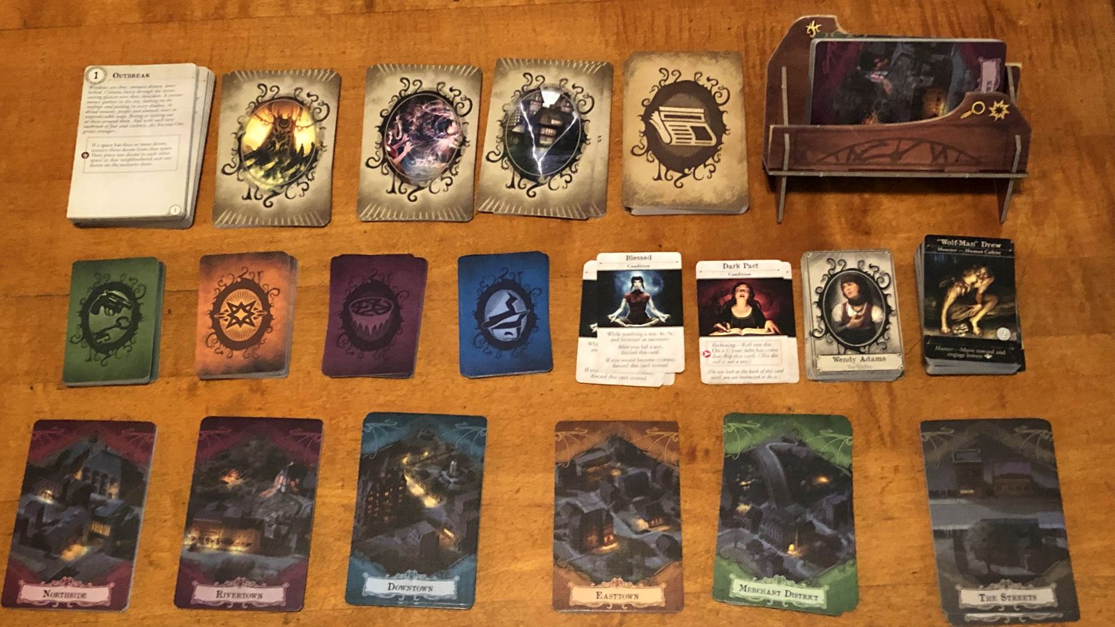 Arkham Horror includes the large cards, small cards, and tokens typical of a Fantasy Flight game. The large cards mostly pertain to the game story and where they take place. The smaller cards show weapons, items, and spells that the investigators use. Tokens for health, sanity, clues, money, and other uses keep track of the player’s well-being and stats. A few anomalies show up in that the game comes with a holder for the Event Deck. It’s useful since the cards in the Event Deck have the same backs as the locations, and sometimes you draw from the bottom of the Event Deck. Also, there isn’t a board in the traditional sense. Instead of a static board composed of locations that’s used for every game, five map tiles are joined by street pieces to create the map.