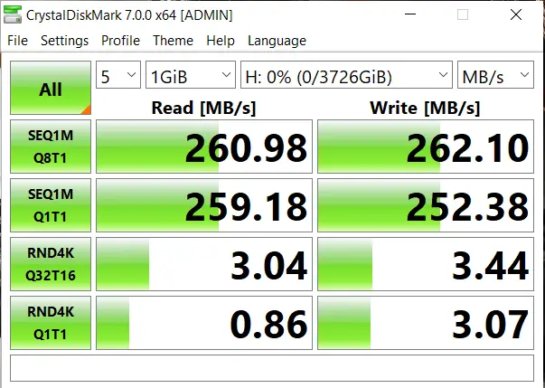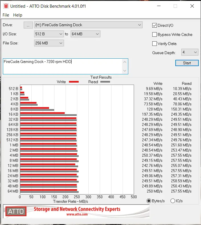 Benchmarking the internal hard drive yields some highly consistent speeds — not a surprise as these IronWolf NAS drives are industry-leading drives for constant use. Running the tests multiple times yielded roughly 260MB/s for read and write, making it clear we are making out the rotational speed of the drive.