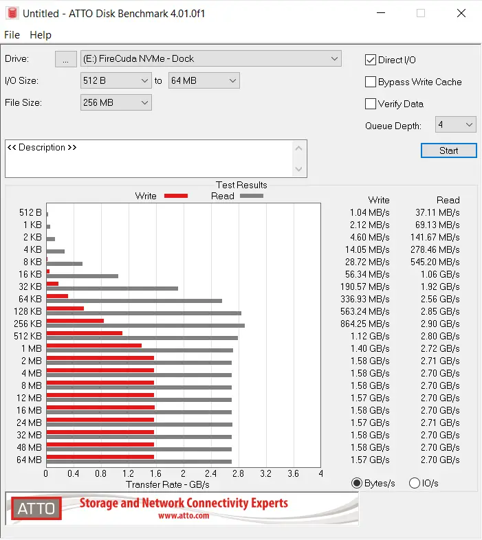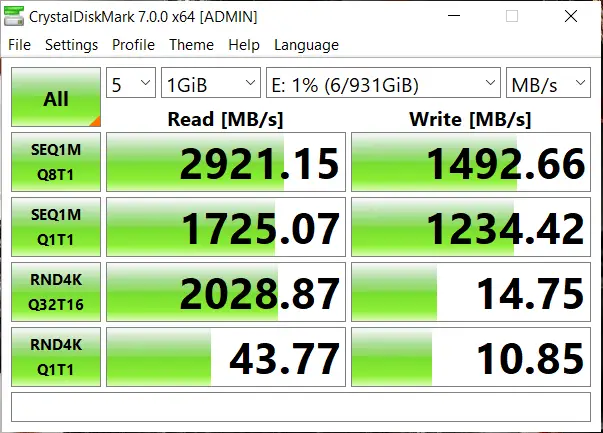 The theoretical maximum of a Gen3 NVMe M.2 drive, and what we saw in our review was a read speed of roughly 3400MB/s and a write speed of 3200MB/s. Here we see about 2900MB/s for read and 1500MB/s for write, thanks to the Thunderbolt 3 connection speed. It’s still dramatically faster than any mechanical solution, but that is a pretty steep drop for puts to the drive.