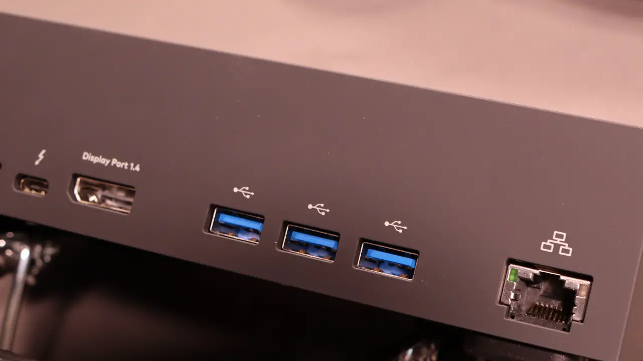 The device exterior is a rubberized surface with venting underneath. Headed around the back of the device you’ll find the power connector, a USB-C port for an external monitor, a single DisplayPort 1.4 connection, and three USB 3.1 Gen 2 ports. There’s also a Gigabit Ethernet RJ45 connector.